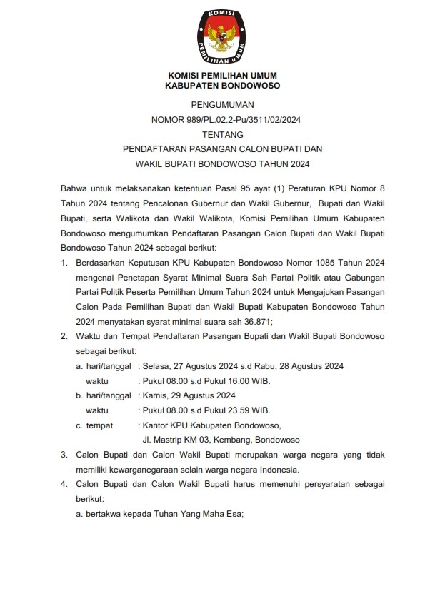 Bahwa untuk melaksanakan ketentuan Pasal 137 Peraturan KPU Nomor 8 Tahun 2024 tentang Pencalonan Gubernur dan Wakil Gubernur, Bupati dan Wakil Bupati, serta Walikota dan Wakil Walikota yang telah diubah dengan Peraturan KPU Nomor 10 Tahun 2024 tentang Perubahan Atas Peraturan KPU Nomor 8 Tahun 2024 tentang Pencalonan Gubernur dan Wakil Gubernur, Bupati dan Wakil Bupati, serta Walikota dan Wakil Walikota, Komisi Pemilihan Umum Kabupaten Bondowoso mengumumkan Hasil Penelitian Persyaratan Administrasi serta Penerimaan Masukan dan Tanggapan Masyarakat terhadap Pasangan Calon Bupati dan Wakil Bupati Bondowoso dalam Pemilihan Serentak tahun 2024 sebagai berikut: