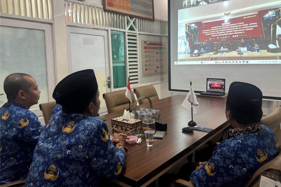 Bondowoso – Dua pegawai KPU Kabupaten Bondowoso yang dinyatakan lolos seleksi Pegawai Pemerintah dengan Perjanjian Kerja (PPPK) Gelombang II mengikuti zoom meeting panggilan melaksanakan tugas PPPK Tenaga Teknis dan Tenaga Kesehatan di lingkungan Sekretariat Jenderal Komisi Pemilihan Umum (KPU) Tahun Anggaran 2024 Periode II, Senin (30/9). Kegiatan ini diagendakan oleh KPU Provinsi Jawa Timur yang dipandu oleh Divisi SDM dan Litbang KPU Provinsi Jawa Timur, Eka Wisnu Wardhana, serta Nanik Karsini, Sekretaris KPU Provinsi Jawa Timur, beserta jajarannya. Turut hadir dalam kegiatan tersebut Sekretaris KPU Kabupaten Bondowoso, Toidin, dan Kasubbag Parmas dan SDM KPU Kabupaten Bondowoso, Fahrurozhi Mashuri.