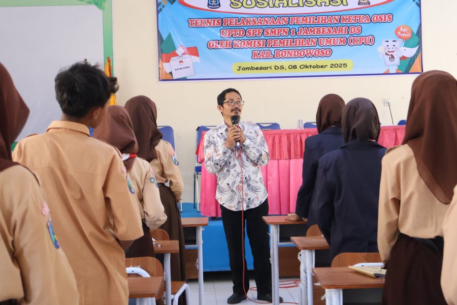 Bondowoso — Dalam upaya menanamkan nilai-nilai demokrasi sejak dini, SMPN 1 Jambesari Darus Sholah menggelar kegiatan Sosialisasi Teknis Pelaksanaan Pemilihan Ketua OSIS Tahun 2025, Sabtu (11/10). Kegiatan yang berlangsung di aula sekolah ini menghadirkan KPU Kabupaten Bondowoso sebagai pemateri untuk memberikan edukasi tentang tata cara berdemokrasi yang baik dan benar.