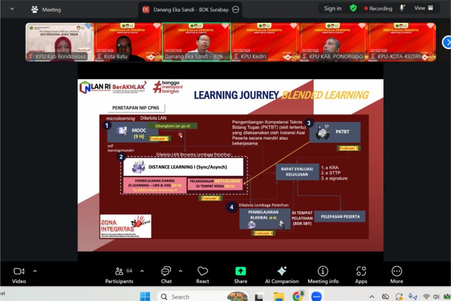 Bondowoso – KPU Kabupaten Bondowoso memastikan kesiapan pendampingan CPNS dengan mengikuti kegiatan Penyamaan Persepsi Mentor dan Coach yang digelar secara daring pada Jumat (13/02/2026). Pertemuan ini menjadi langkah awal untuk menyelaraskan pemahaman terkait pelaksanaan Mentoring dan Penguatan Kompetensi Teknis Bidang Tugas (PKTBT) dalam rangkaian aktualisasi Latsar CPNS.