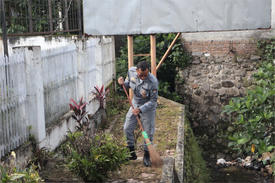 Beberapa pegawai tampak merapikan rumput yang mulai tumbuh, sementara lainnya membersihkan lumut yang menempel di sejumlah sudut lantai halaman. Sebagian lain menata kursi dan membersihkan area dapur untuk lokasi buka puasa. Kegiatan dilakukan secara bergotong royong sehingga berbagai titik dapat ditangani dalam waktu yang bersamaan. Suasana kerja berlangsung santai, namun tetap penuh kekompakan.