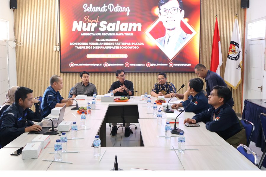 Bondowoso — Anggota Komisi Pemilihan Umum (KPU) Provinsi Jawa Timur, Nur Salam, melakukan monitoring terhadap proses pengisian Indeks Partisipasi Pilkada Tahun 2024 di KPU Kabupaten Bondowoso. Kegiatan ini berlangsung pada Selasa, 29 April 2025, di Kantor KPU Kabupaten Bondowoso, Jalan Mastrip Km 3, Kembang, Bondowoso.