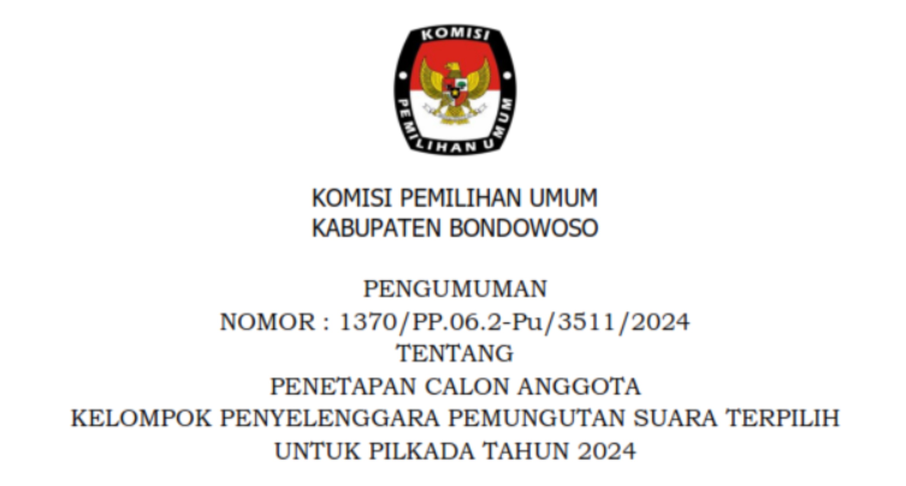 PENGUMUMAN NOMOR : 1370/PP.06.2-Pu/3511/2024 TENTANG PENETAPAN CALON ANGGOTA KELOMPOK PENYELENGGARA PEMUNGUTAN SUARA TERPILIH UNTUK PILKADA TAHUN 2024.