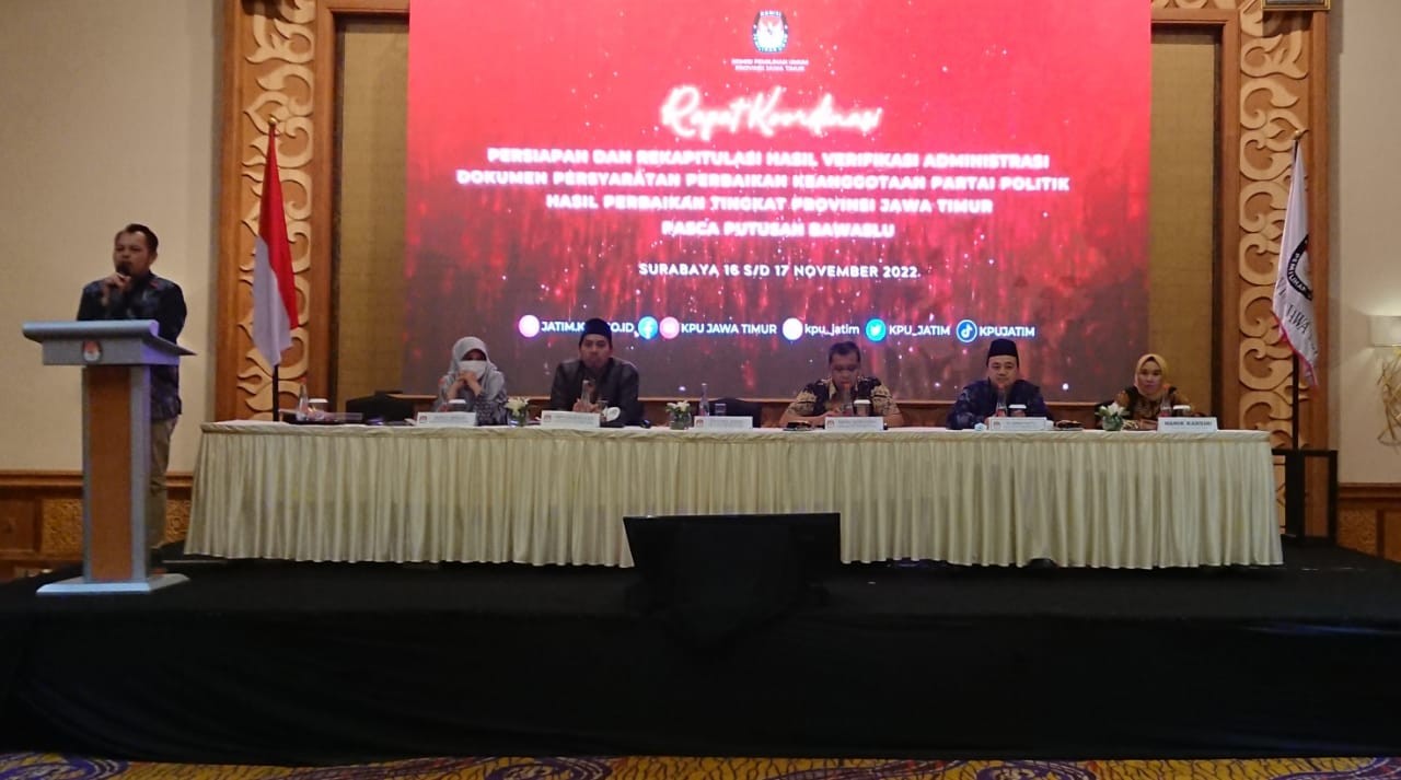 Kegiatan yang dilaksanakan pada tanggal 18 sampai 19 November 2022 ini bertempat di Ballroom Hotel Mercure Grand Mirama Surabaya dengan mengundang Divisi Sosdiklih, Parmas dan SDM, Sekretaris, Kepala Subbagian Hukum dan SDM, serta Operator SIAKBA dari 38 KPU Kabupaten/Kota di wilayah Jawa Timur.