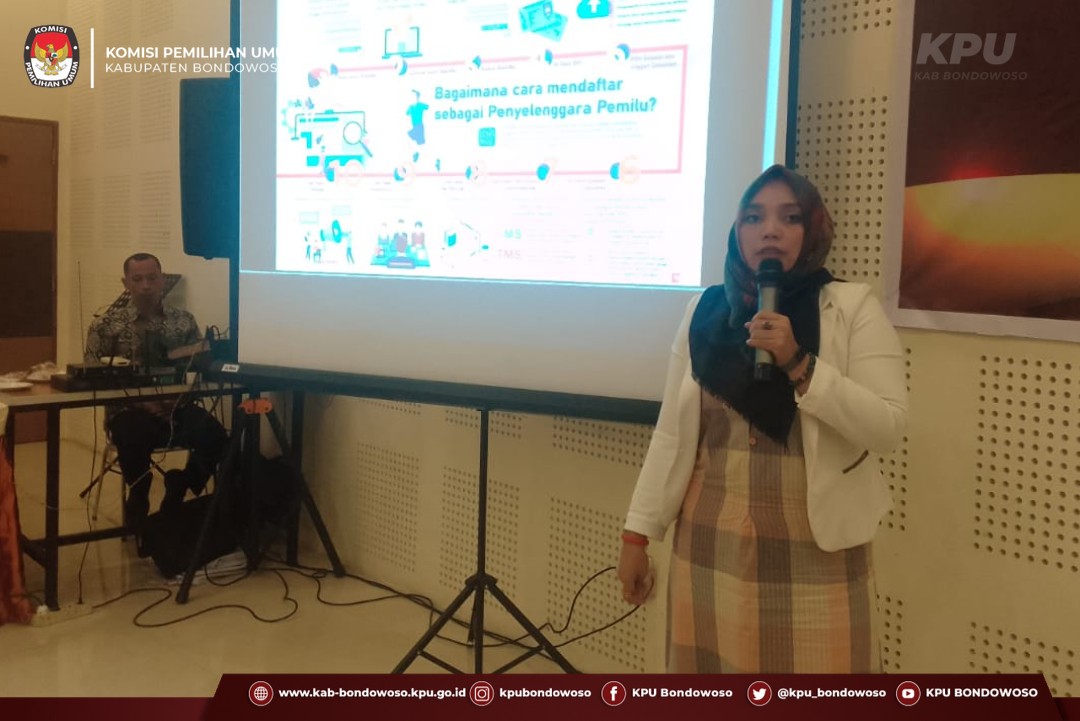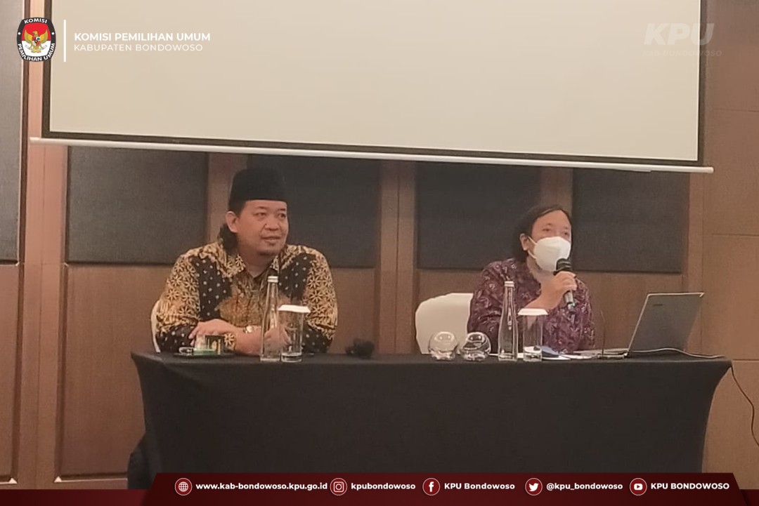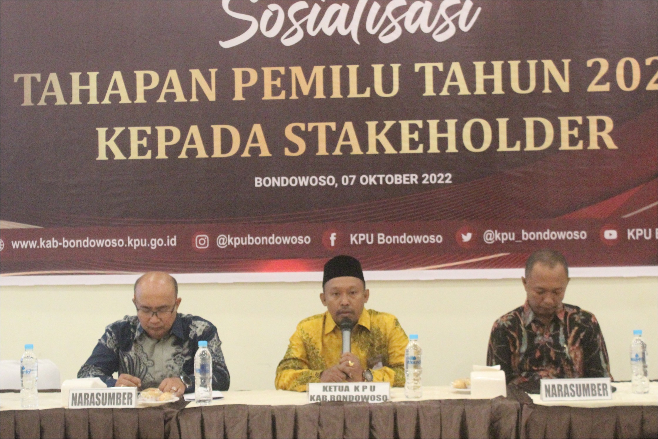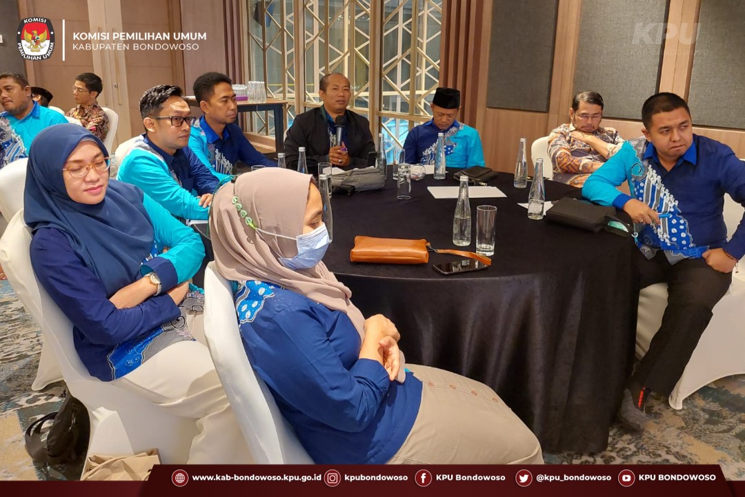 BONDOWOSO - Komisi Pemilihan Umum Kabupaten Bondowoso mengundang 23 Camat se-Kabupaten Bondowoso dalam rangka mensosialisasikan Tahapan Pemilu Tahun 2024. KPU Bondowoso juga mengundang Ketua dan Anggota Bawaslu, Kepala Dispendukcapil, Kepala Bakesbangpol, Kepala Dinas Kominfo, serta Kasat Pol PP Kabupaten Bondowoso. Sosialisai tersebut dilaksanakan di Mini Hall Dreamland Hotel Bondowoso, Jum’at (07/10/2022). Dalam sosialisasi tersebut KPU Bondowoso mengundang A. Warits, Ketua Bawaslu Provinsi Jawa Timur sebagai narasumber. Selain itu, sebagai narasumber ke-2 KPU Bondowoso juga mengundang Sekretaris Daerah (Sekda) Kabupaten Bondowoso yang dalam hal ini diwakilkan oleh Asisten 1 dikarenakan Sekda berhalangan untuk hadir. Junaidi, Ketua KPU Bondowoso dalam sambutan pembukaannya mengatakan, sosialisasi tersebut dilakukan sebagai upaya KPU Bondowoso untuk menginformasikan kepada Stakeholder terkait Tahapan Pemilu tahun 2024 yang sedang berlangsung saat ini. Ia menyampaikan bahwa saat ini KPU Bondowoso sedang melakukan Tahapan verifikasi keanggotaan Partai Politik. Selain itu, Junaidi juga memberitahukan bahwa pada pertengahan bulan oktober ini KPU Bondowoso akan menerjunkan Tim ke 23 Kecamatan di Kabupaten Bondowoso dalam rangka melakukan Verifikasi Faktual (Verfak) keanggotaan Partai Politik. “ini meupakan kulonuwon kami kepada para camat karena pada waktu dekat ini tepatnya pada tanggal 15 oktober, kami akan melaksanakan verifikasi faktual, kami akan menerjunkan beberapa personil ke seluruh kecamatan di kabupaten bondowoso, kami juga ingin merapatkan barisan dengan seluruh stakeholder dalam rangka menyukseskan pemilu 2024,” tutur Junaidi. A.Warits disela-sela pemaparan materinya terkait Pengawasan Pemilu Partisipatif Bersama Stakeholder, mengatakan, kesuksesan Pemilu itu tidak hanya bergantung kepda penyelenggara, tetapi juga peran aktif serta dukungan dari Pemerintah Daerah juga menjadi sangat penting. Selain itu, Asisten 1 Pemkab Bondowoso, Mahfud Junaidi menyampaikan bahwa Pemerintah Daerah dalam hal ini Camat se-Kabupaten Bondowoso siap memberikan dukungan untuk suksesnya Pemilu 2024. “insyaallah seluruh camat di kabupaten bondowoso siap mendukung KPU untuk menyukseskan Pemilu 2024,” ujarnya. Selanjutnya, acara diakhiri dengan sesi tanya jawab serta sumbangsih saran dari beberapa kecamatan kepada KPU. Saran yang diberikan berdasarkan pengalaman teknis yang terjadi di lapangan pada Pemilu 2019 kemarin. (Fiq)