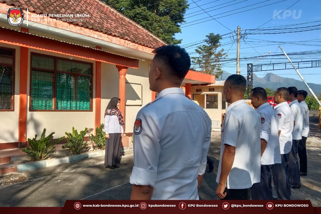 Bondowoso (18/07/2022) - Komisi Pemilihan Umum Kabupaten Bondowoso mengupdate kompetensi diri pegawai melalui pelaksanaan apel pagi saat memasuki Tahapan Pemilu 2024. Apel dilaksanakan di halaman Kantor KPU Bondowoso (Jl. Mastrip KM 3 Kembang Bondowoso) serta diterima langsung oleh Kepala Sub Bagian Keuangan, Umum dan Logistik (Kasubbag KUL), Adiets Nurhasanah memberikan motivasi serta pembinaan kepada peserta apel, “memasuki Tahapan Pemilu 2024, mari fokus pada tupoksi, pahami regulasi Tahapan Pemilu dan Update diri” tuturnya Kegiatan rutin tersebut merupakan wadah dalam melakukan pembinaan pegawai serta motivasi kepada pegawai KPU Bondowoso dalam melaksanakan kegiatan setiap hari, apel pagi juga merupakan momentum silaturrahmi antar sesama pegawai setelah libur akhir pekan. Apel diikuti oleh seluruh pegawai KPU Bondowoso, turut hadir Ali Mushofa Divisi Perencanaan Data dan Informasi serta Heniwati Divisi Teknis Penyelenggaraan. Di akhir penyampaian setelah penghormatan, Kasubbag KUL KPU Bondowoso memimpin do’a bersama dengan harapan semua pegawai diberikan kesehatan, keselamatan dan kelancaran dalam menjalani aktifitas. (Dy)