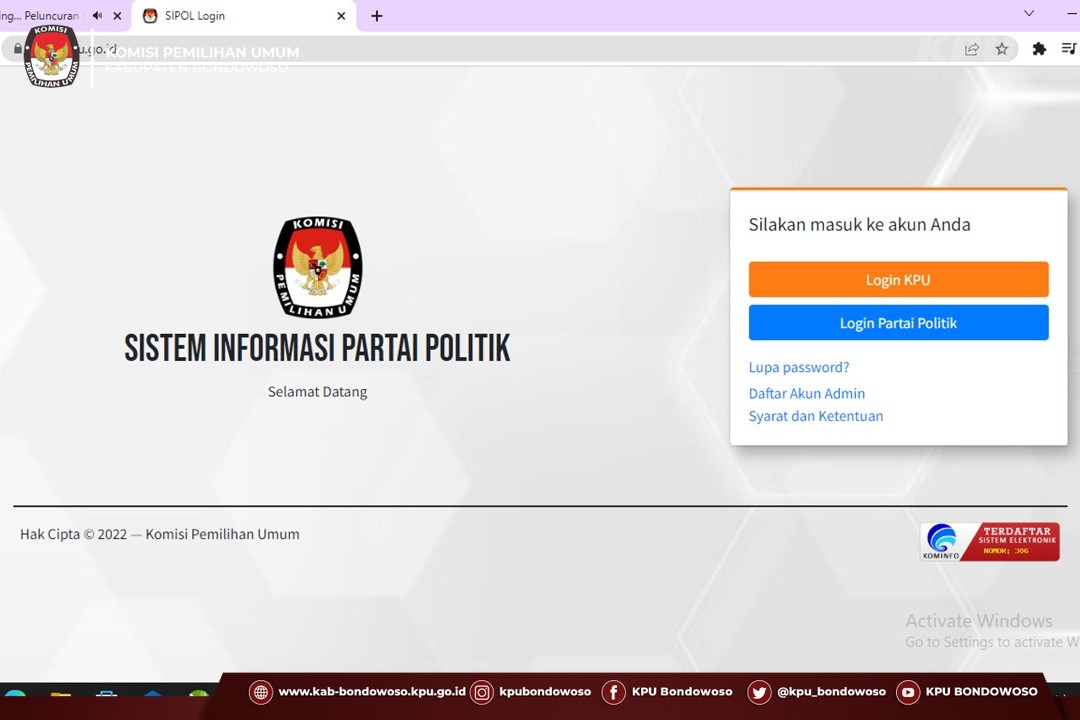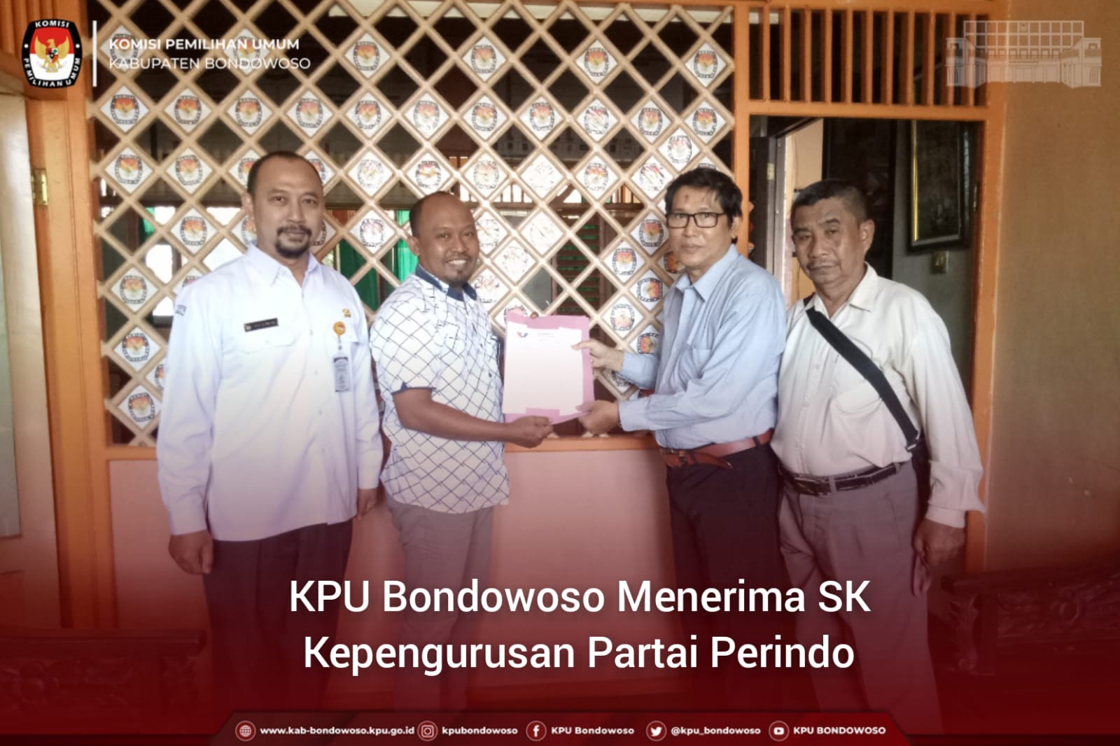 Bondowoso (27-06-2022) - Komisi Pemilihan Umum (KPU) Kabupaten Bondowoso menerima Surat Keputuan (SK) Kepengurusan Dewan Pimpinan Daerah (DPD) Partai Perindo Bondowoso. Surat keputusan diantar secara langsung oleh Ketua DPD Partai Perindo Bondowoso, A. Fadil Jaelani, SH., MH. beserta Sekretaris DPD Partai Perindo Bondowoso, Drs. H. Zaini. Ketua DPD Perindo Bondowoso, A. Fadil Jaelani, menjelaskan bahwa maksud dan tujuan berkunjung ke Kantor KPU Bondowoso adalah dalam rangka silaturrahim dan menyampaikan SK Kepengurusan DPD Partai Perindo Kabupaten Bondowoso. Penyampaian SK tersebut diterima secara langsung oleh Ketua KPU Kabupaten Bondowoso didampingi oleh Kasubbag Teknis Penyelenggaraan, Partisipasi dan Hubungan Masyarakat. Ketua KPU Kabupaten Bondowoso, Junaidi, menyampaikan sekilas terkait jadwal verifikasi partai politik. "Kita dari KPU Bondowoso akan melakukan verpol sesuai jadwal dari KPU RI, dimulai tanggal 29 Juli sampai dengan 14 Desember 2022", terang Junaidi. Sebagaimana diketahui bahwa KPU RI telah menetapkan jadwal pendaftaran partai politik yang dimulai sejak 29 Juli 2022 mendatang. Sementara itu, sebagai alat bantu dalam proses pendaftaran, KPU juga telah membuka akses Sipol bagi partai politik agar bisa memulia input data yang nantinya akan digunakan dalam proses pendaftaran. (mipa)