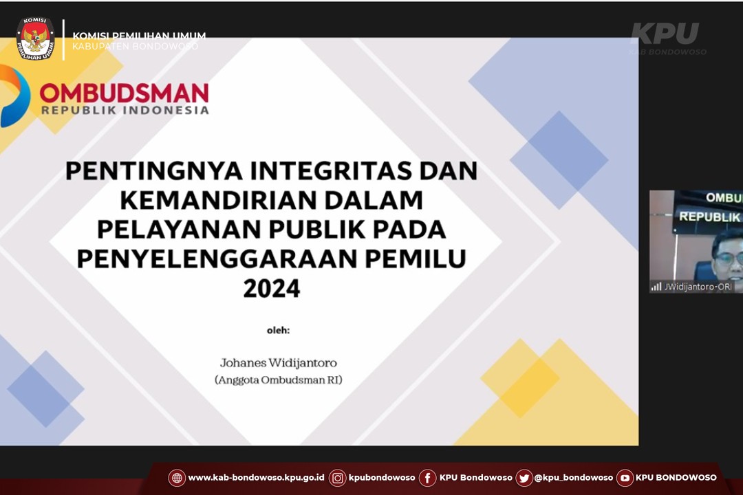 Bondowoso (31/05/2022) – Komisi Pemilihan Umum (KPU) sebagai lembaga penyelenggara pemilihan umum dan pemilihan penting untuk membangun integritas dan kemandirian dalam melakukan pelayanan publik kepemiluan pada Pemilu Serentak Tahun 2024. Hal tersebut disampaikan oleh narasumber dalam Pelatihan Peningkatan Pelatihan Untuk Kesuksesan Pemilu Tahun 2024. Anggota Ombudsman RI, Johanes Widijantoro, secara lebih detail menyampaikan materi terkait Pentingnya Integritas dan Kemandirian dalam Pelayanan Publik pada Penyelenggaraan Pemilu Tahun 2024. Disampaikan oleh Johanes Widijantoro bahwa integritas penyelenggara ini penting karena membawa manfaat bagi banyak orang, meningkatkan image dan kepercayaan publik, mengurangi perilaku KKN, meningkatkan kinerja individu, meningkatkan kepuasan dan motivasi kerja, melaksanakan prinsip rule of law, dan memelihara stabilitas nasional. Meskipun demikian, terdapat beberapa tantangan yang harus dihadapi, yakni budaya KKN, rendahnya etos dan budaya melayani, misi pelayanan publik yang tidak jelas, moral yang rusak, gaji yang tidak memadai, dan komitmen dan dukungan etika yang rendah. (mipa)