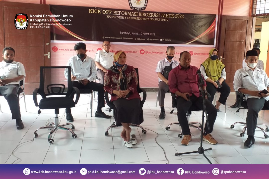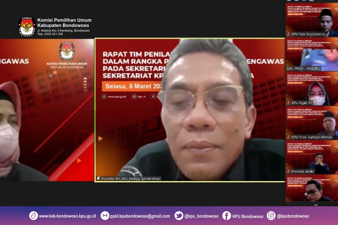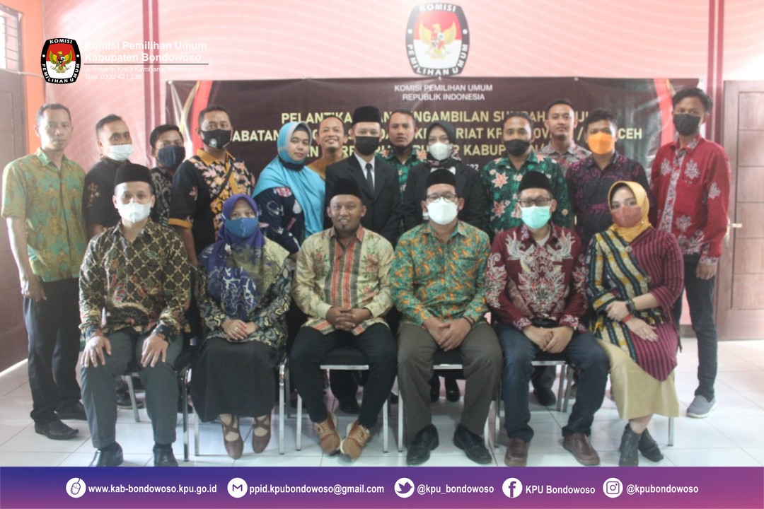 BONDOWOSO - Sebanyak 4 jabatan pengawas/ Kepala Sub Bagian yang kosong sejak 2021 akhirnya diisi oleh KPU RI. Sekretaris KPU Provinsi Jawa Timur Nanik Karsini melantik para Kasubbag di KPU Bondowoso bersama dengan KPU Kabupaten/Kota se-Jawa Timur pada Jumat 11 Maret 2022 secara daring dan luring. Sesuai dengan Surat Sekretaris Jenderal Komisi Pemilihan Umum Republik Indonesia (KPU RI) Nomor : 536/SDM.05.5-SD/04/2022 empat Kasubbag yang dilantik adalah Adiets Nurhasanah sebagai Kasubbag Keuangan, Umum dan Logistik serta Fahrurozhi Mashuri sebagai Kasubbag Hukum dan SDM. Selain itu, KPU RI melalui KPU Provinsi Jawa Timur juga melantik Mohammad Ilyas Purwo Agomo sebagai Kasubbag Teknis dan Hupmas serta Amma Abriansyah sebagai Kasubbag Perencanaan Data dan Informasi. Ilyas sebelumnya menjabat sebagai Kasubbag Teknis dan Hupmas di KPU Kota Pasuruan, sedangkan Amma sebelumnya sebagai staf Subbag Program Data di KPU Kabupaten Sidoarjo. Pelantikan itu dilaksanakan mulai 14.00 WIB secara daring di aula Kantor KPU Bondowoso dan memerapkan protokol kesehatan (Prokes) secara ketat. Kegiatan di awali dengan menyanyikan Lagu Kebangsaan (Indonesia Raya) dilanjutkan dengan pembacaan Surat Keputusan, pelantikan dan pengambilan sumpah janji oleh Sekretaris KPU Provinsi Jawa Timur Nanik Karsini. Dalam sambutannya, Sekretaris KPU Provinsi Jawa Timur Nanik Karsini menyampaikan ucapan selamat kepada Kasubbag terlantik. ”Selamat atas dilantiknya, semoga dapat mengemban amanah dengan penuh tanggung jawab,” tuturnya. Hadir dalam kegiatan tersebut Ketua KPU Bondowoso Junaidi, Anggota KPU Divisi Rendatin Ali Mushofa, Divisi Teknis Heniwati, Divisi Hukum Amirudin Makruf, dan Divisi SDM Parmas Sunfi Fahlawati, Sekretaris KPU Bondowoso serta Kasi Bimas Islam Kemenag Bondowoso Astono sebagai rohaniwan serta Pegawai Pemerintah Non Pegawai Negeri (PPNPN) KPU Bondowoso.. (Dy/Linda/Ghif)