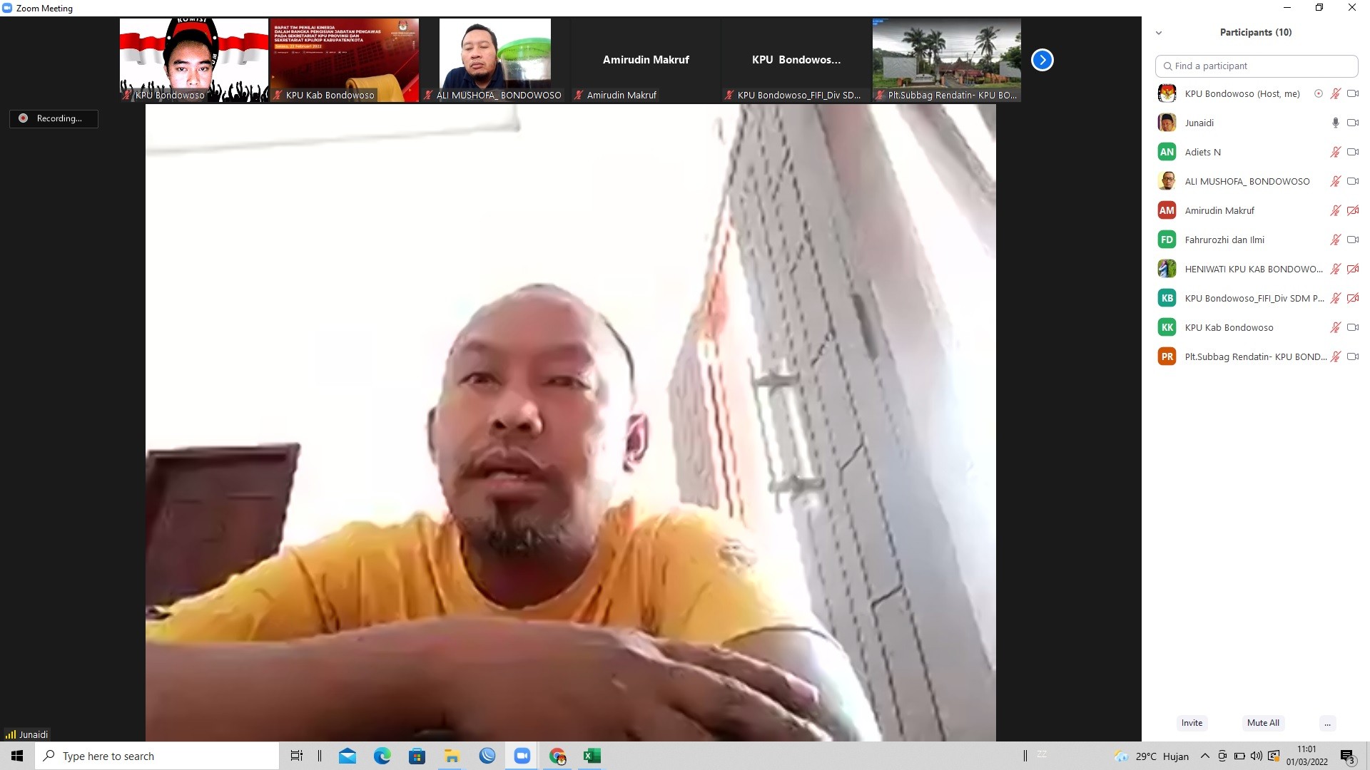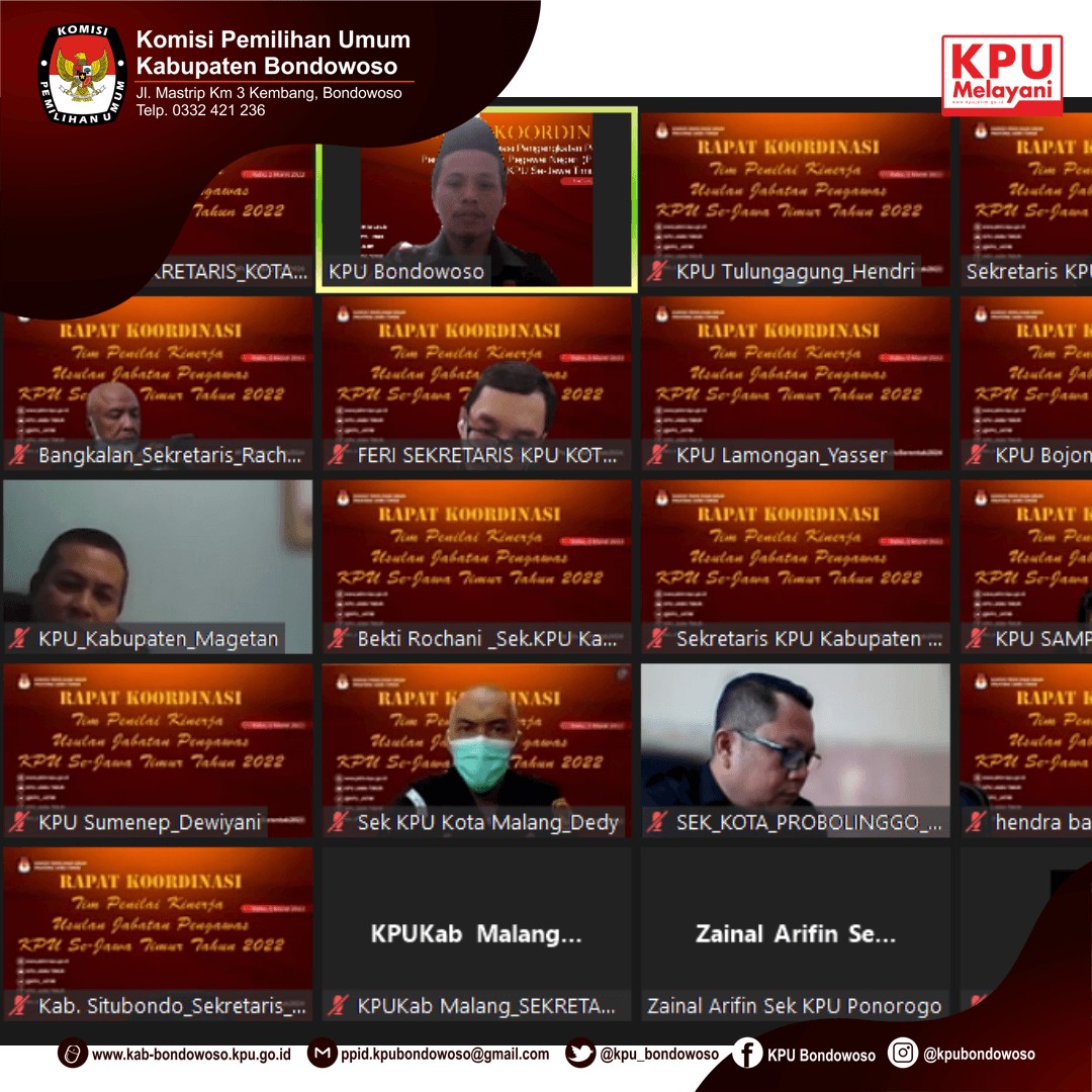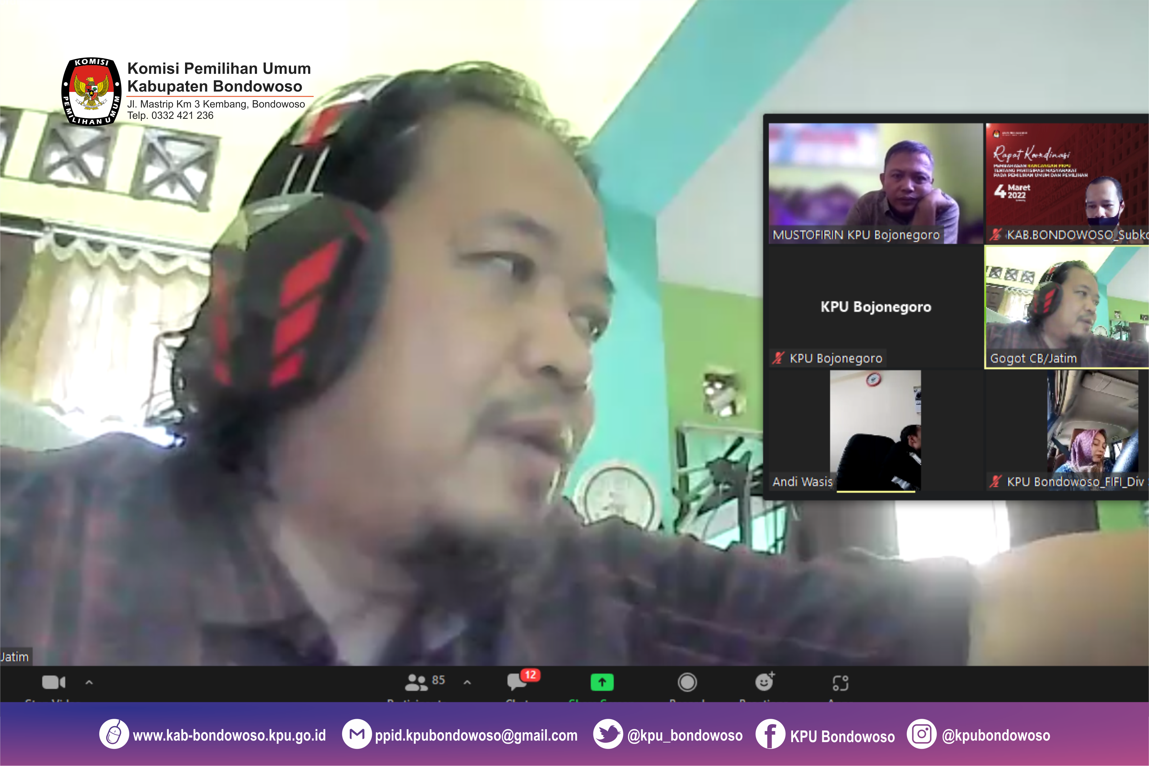 KPU Kabupaten Bondowoso melaksanakan rapat penetapan daftar pemilih berkelanjutan periode Bulan Februari tahun 2022 pada hari Selasa (1/3/2022). Rapat Penetapan DPB digelar secara virtual melalui aplikasi Zoom Meeting, Adapun dalam rapat pleno penetapan Bulan Februari tahun 2022 dihadiri oleh Ketua KPU, Junaidi, Anggota KPU Divisi Rendatin, Ali Mushofa, Divisi Teknis, Heniwati, Divisi Hukum, Amirudin Makruf, dan Divisi SDM Parmas, Sunfi Fahlawati beserta Sekrertaris dan Plt Kasubbag.
