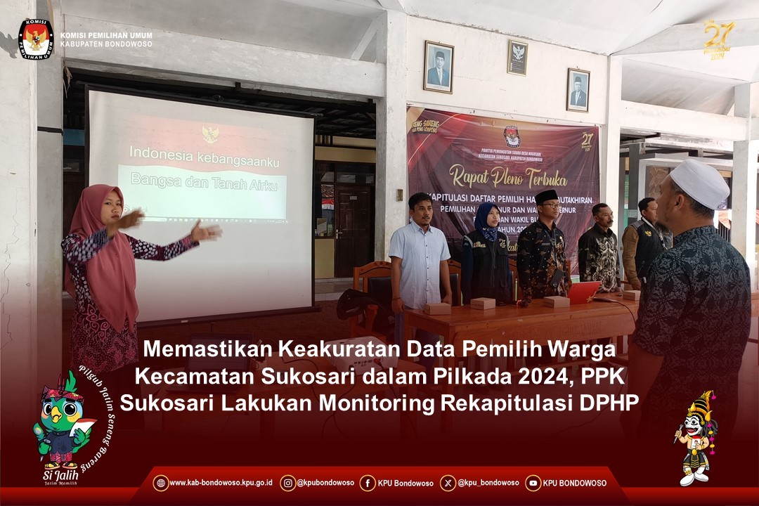 Bondowoso (02/08/2024) - Panitia Pemilihan Kecamatan (PPK) Botolinggo telah melaksanakan monitoring intensif terhadap pelaksanaan Pleno Rekapitulasi Daftar Pemilih Hasil Pemutakhiran (DPHP) Tingkat Panitia Pemungutan Suara (PPS) di delapan desa se-Kecamatan Botolinggo selama dua hari, yaitu Kamis dan Jumat, 1-2 Juli 2024. Kegiatan ini bertujuan untuk memastikan semua tahapan pleno berjalan sesuai dengan prosedur yang ditetapkan dalam Peraturan KPU Nomor 7 Tahun 2024 tentang Penyusunan Daftar Pemilih pada Penyelenggaraan Pilkada Serentak Tahun 2024.