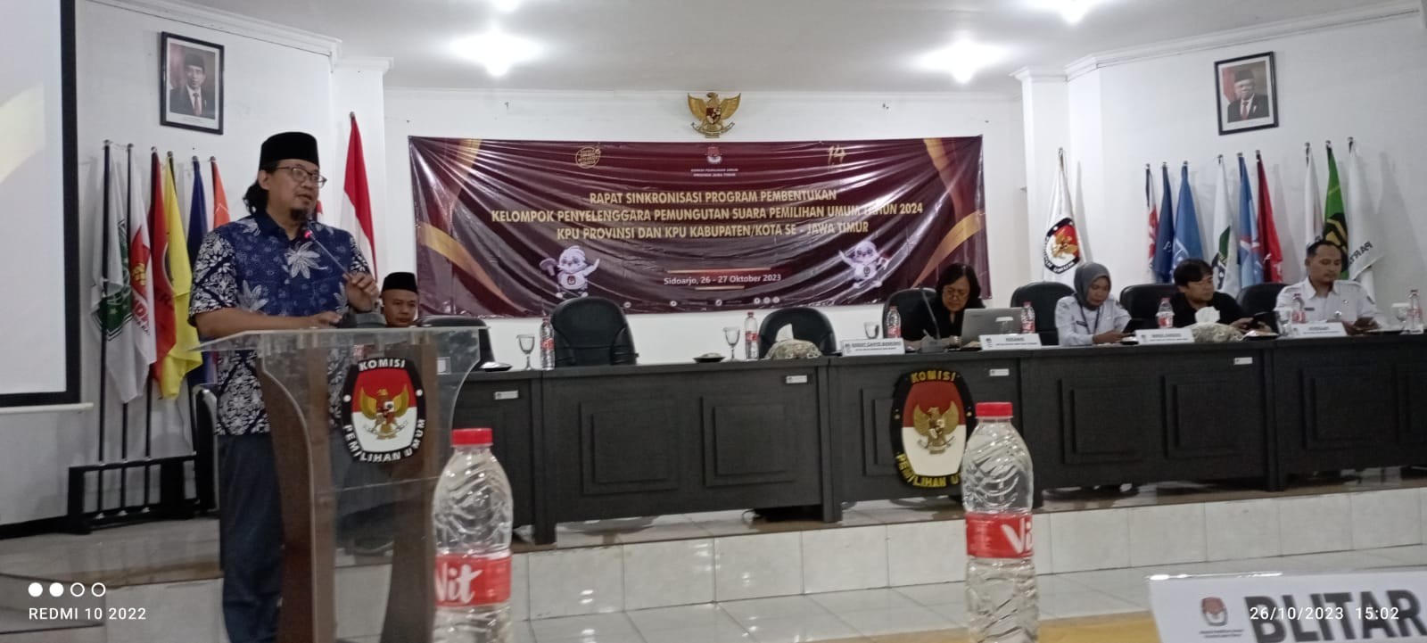 Sidoarjo - Komisi Pemilihan Umum Kabupaten Bondowoso hadiri Rapat Sinkronisasi Program Pembentukan Kelompok Penyelenggara Pemungutan Suara (KPPS) Pemilu Tahun 2024 KPU Provinsi Jawa Timur dan KPU Kabupaten/Kota Se-Jawa Timur. Kegiatan yang dilaksanakan di Kantor Komisi Pemilihan Umum Kabupaten Sidoarjo pada tanggal 26 sampai 27 Oktober 2023 dengan mengundang Divisi Sosdiklih, Parmas dan SDM, Sekretaris dan Kepala Subbagian Hukum dan SDM dari 38 KPU Kabupaten/Kota di wilayah Jawa Timur. Selanjutnya, acara diisi sambutan dan pembukaan oleh Ketua Divisi Sosialisasi, Pendidikan Pemilih, Partisipasi Masyarakat KPU Jatim Gogot Cahyo Baskoro. Dalam kesempatan tersebut, Gogot Cahyo Baskoro Menyampaikan agar KPU Kabupaten/Kota mempersiapkan perekrutan KPPS lebih awal. Agar kesulitan seperti di tahun tahun sebelumnya tidak terjadi dalam mendapatkan tenaga KPPS, karena SDM yang kita butuhkan itu banyak terdiri orang orang pintar, sehingga perlu dipersiapkan jauh-jauh hari. "Tolong untuk publikasi di berbagai media sosial yang kita miliki diperbanyak agar memudahkan dalam pelaksanaan rekrutmen"imbuhnya. Selain itu Gogot Cahyo Baskoro juga menyampaikan kepada peserta rapat untuk bisa berkoordinasi dengan Pemerintah Kabupaten/Kota masing-masing agar mendapatkan kemudahan pelayanan dalam pelaksanaan tes kesehatan dalam perekrutan KPPS serta KPU Kabupaten/Kota benar-benar harus memperhatikan kemampuan calon anggota KPPS. "Kompetensi, keahlian dan skill KPPS harus benar benar diunggulkan karena Pemilu kedepan banyak menggunakan teknologi informasi"pungkasnya.(Alv)