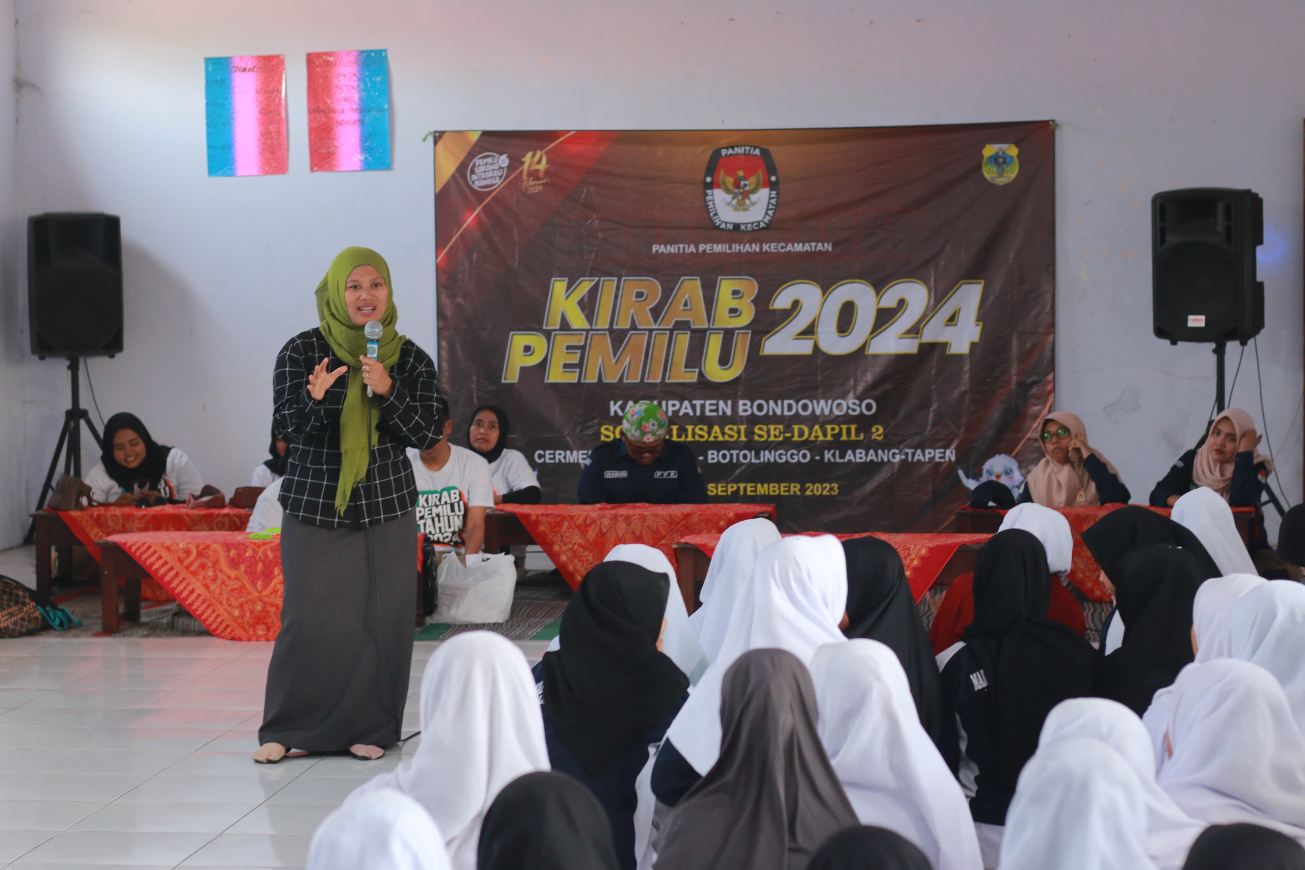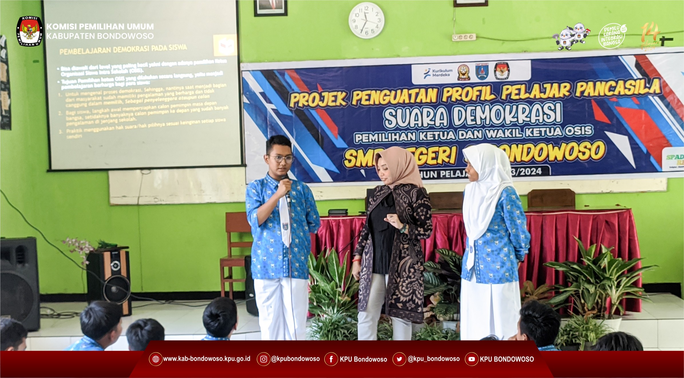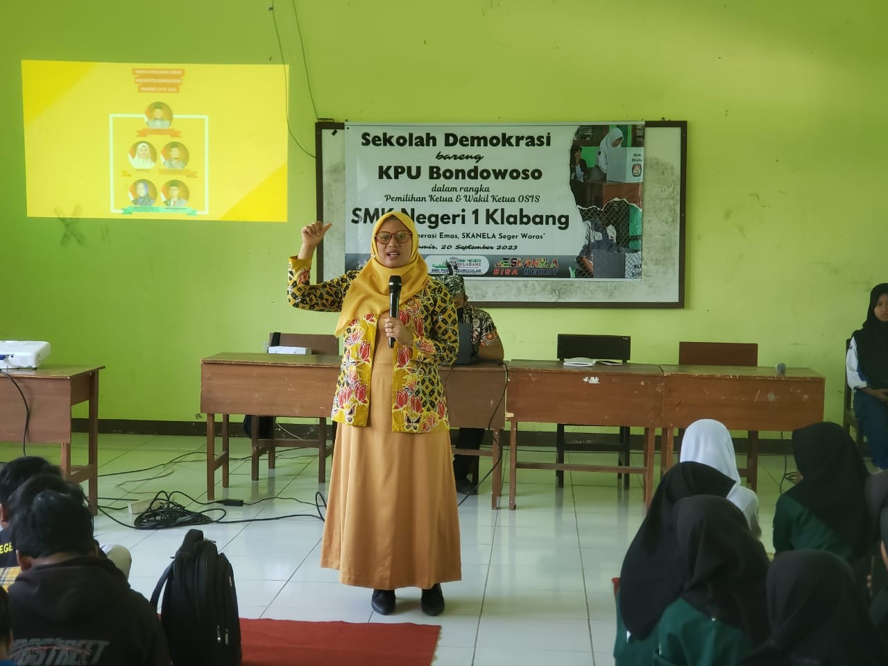 Heniwati, Divisi Teknis Penyelenggaraan KPU Bondowoso hadir sebaga narasumber dalam acara Sekolah Demokrasi yang diselesnggarakan oleh SMK Negeri 1 Klabang, Kamis 21 September 2023. Acara tersebut diadakan dalam rangka memberikan pemahaman yang lebih mendalam tentang demokrasi dan peran masyarakat dalam pelaksanaan Pemilihan Umum. Heniwati tidak hanya memberikan pemahaman yang komprehensif tentang konsep demokrasi, tetapi juga menyoroti bagaimana menjadi pemilih yang cerdas dalam proses pemilu. Dalam paparannya, Heniwati menggambarkan demokrasi sebagai sistem pemerintahan di mana keputusan dibuat oleh rakyat, untuk rakyat, dan oleh rakyat. Dia menjelaskan bagaimana pentingnya peran aktif masyarakat dalam menjalankan demokrasi, termasuk hak dan kewajiban sebagai warga negara. Heniwati juga menyoroti pentingnya memilih pemimpin yang berkualitas melalui pemilu sebagai fondasi kuat demokrasi yang sehat. Para siswa-siswi SMK Negeri 1 Klabang yang hadir di acara tersebut terlihat sangat antusias mengikuti presentasi Heniwati. Mereka bertanya, berdiskusi, dan dengan penuh semangat mencerna setiap informasi yang disampaikan. Bahkan, ketika sesi tanya jawab dimulai, banyak siswa yang dengan percaya diri melontarkan pertanyaan yang cerdas tentang demokrasi dan proses pemilihan. Tidak hanya memberikan pengetahuan, KPU Bondowoso juga memberikan doorprize bagi siswa-siswi yang berhasil menjawab pertanyaan dengan baik dalam sesi tanya jawab. Hal ini semakin memeriahkan acara dan mendorong partisipasi aktif dari semua peserta. Dengan antusiasme dan semangat yang begitu besar dari siswa-siswi SMK Negeri 1 Klabang, tampaknya masa depan demokrasi di Bondowoso akan menjadi lebih cerah, dengan pemilih-pemilih muda yang siap untuk membentuk masa depan bangsa melalui partisipasi aktif dalam pemilu.