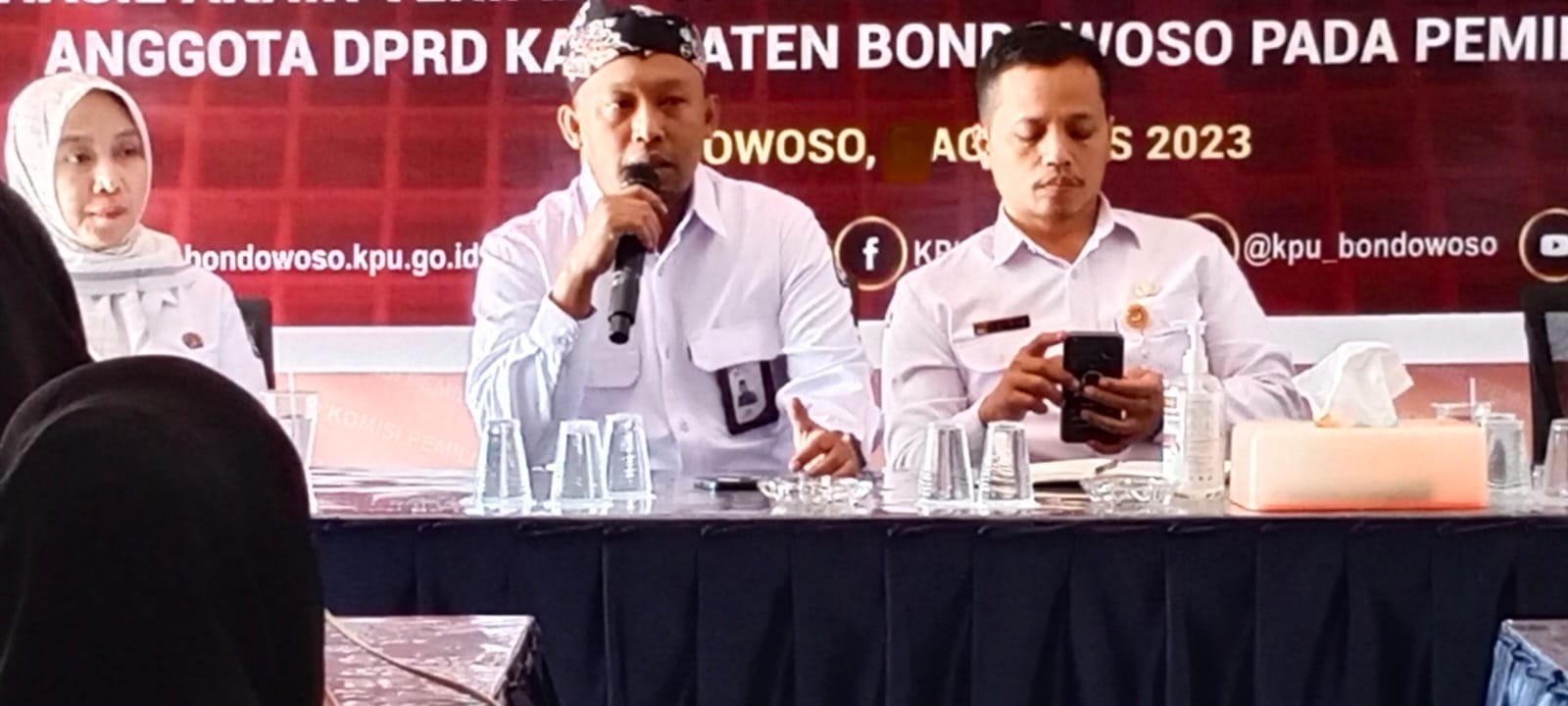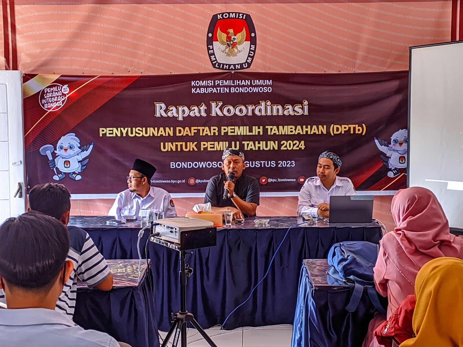 Bondowoso - Komisi Pemilihan Umum (KPU) Kabupaten Bondowoso menggelar Rapat Koordinasi (Rakor) Penyusunan Daftar Pemilih Tambahan (DPTb) untuk Pemilu Tahun 2024 bersama Panitia Pemilihan Kecamatan (PPK) Se Kabupaten Bondowoso, Senin (14/08/23). Rapat koordinasi ini dibuka secara resmi oleh Ketua KPU Bondowoso Junaidi di Aula Kantor KPU Bondowoso, dalam sambutannya pada pembukaan Rakor tersebut, Junaidi mengutarakan harapannya pada peserta rakor untuk memaksimalkan penyusunan DPTb. Selain itu, Junaidi juga mengingatkan agar kegiatan penyusunan DPTb dilaksanakan dengan cermat dan teliti untuk memberikan hak sebagai pemilih dengan baik. Dalam rakor tersebut, DIvisi Perencanaan Data dan Informasi KPU Bondowoso Ali Mushofa juga memaparkan secara detail terkait syarat pindah memilih, pelayanan pindah memilih, dokumen alat bukti pendukung alasan pindah memilih, tabel referensi kondisi pindah memilih dan surat suara yang didapatkan oleh pemilih tersebut. Sesi terakhir Rakor yakni teknis operasionalisasi Sidalih untuk DPTb. Dilakukan simulasi penginputan data pemilih yang ingin melakukan pindah memilih ke dalam aplikasi Sidalih oleh Operator Sidalih KPU Bondowoso Hairul Umam. (Rendatin)