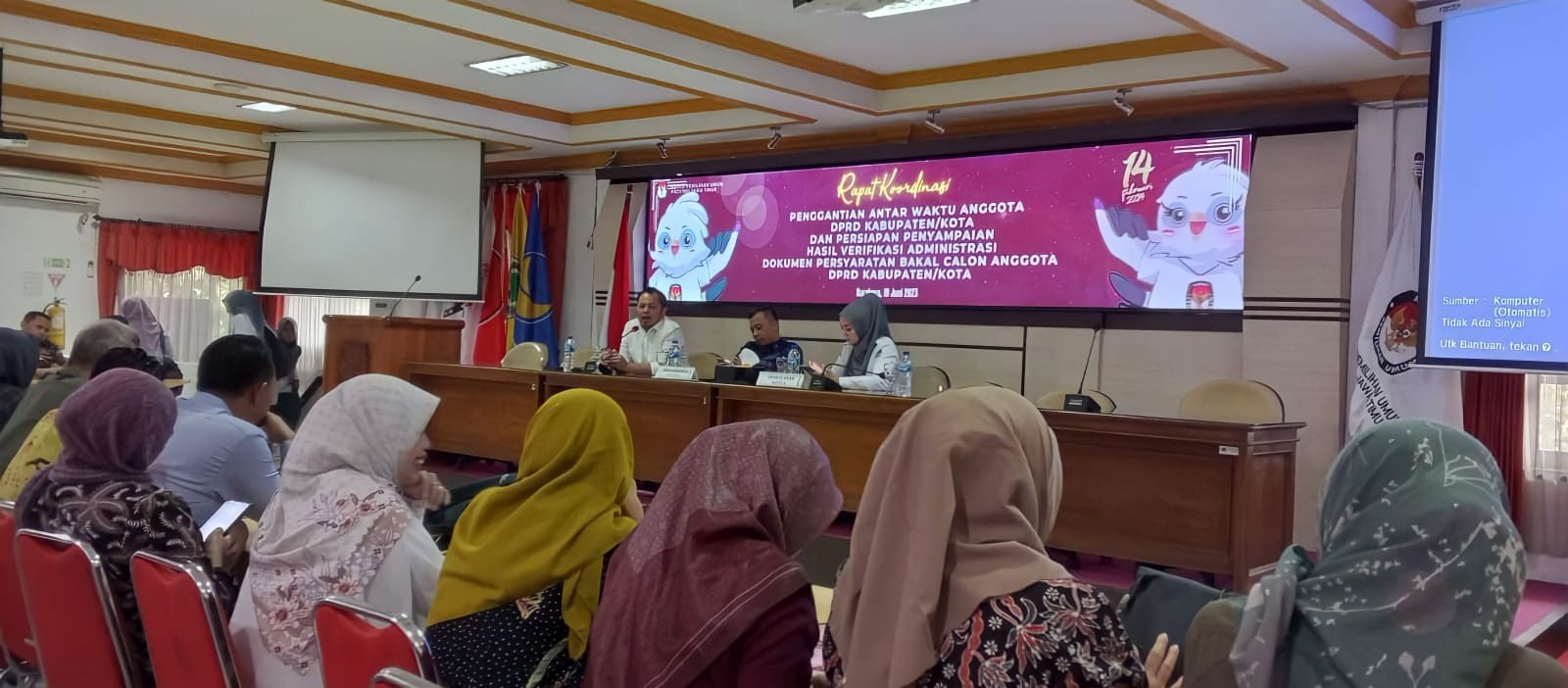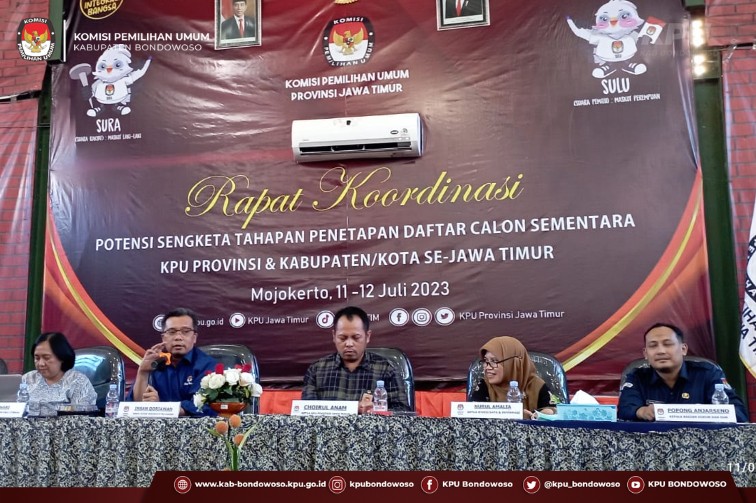 Mojokerto - Komisi Pemilihan Umum Kabupaten Bondowoso menghadiri Rapat Koordinasi Potensi Sengketa Tahapan Penetapan Daftar Calon Sementara KPU Kabupaten/Kota se-Jatim (11/07/2023) oleh KPU Provinsi Jawa Timur. Acara dilaksanakan selama 2 (dua) hari tanggal 11 sampai dengan 12 Juli 2023 yang di ikuti oleh Divisi Hukum dan Pengawasan serta kepala Sub Bagian Hukum dan SDM Se-Jawa Tumur. Selanjutnya Sambutan sekaligus pembukaan oleh Ketua Komisi Pemilihan Provinsi Jawa Timur, Choirul Anam. Menyampaikan bahwa potensi sengketa disetiap tahapan bersumber pada 2 (dua) hal, pertama faktor internal dan yang kedua adalah faktor eksternal. "Kawan-kawan harus paham betul Regulasi apalagi Divisi Hukum dan Pengawasan harus bisa memberikan advokasi kepada internal dan juga menjelaskan kepada pihak eksternal jika ada pertanyaan-pertanyaan, harapan kami kawan-kawan Divisi Hukum mampu memahami seluruh regulasi di setiap Tahapan sehingga saat divisi yang lain membutuhkan advokasi kawan-kawan mampu mengadvokasi dengan baik." Tambahnya. Setelah itu acara dilanjutkan pada kegiatan inti yaitu Rapat Koordinasi Potensi Sengketa Tahapan Penetapan Daftar Calon Sementara KPU Kabupaten/Kota se-Jatim oleh Wakil Divisi Hukum dan Pengawasan KPU Provinsi Jawa Timur, Insan Qoriawan.(Alv)