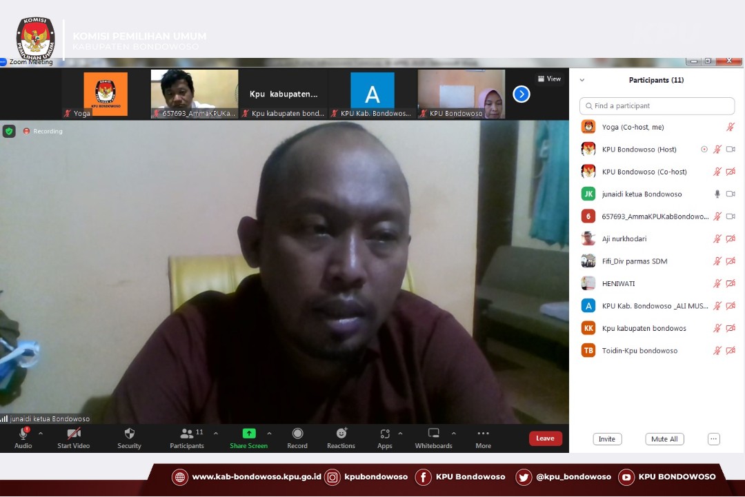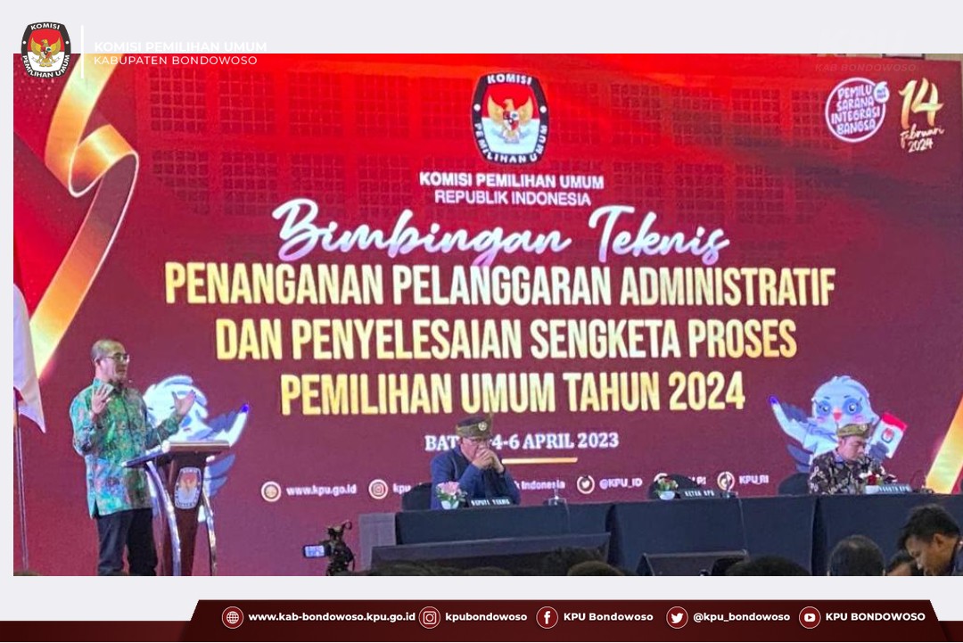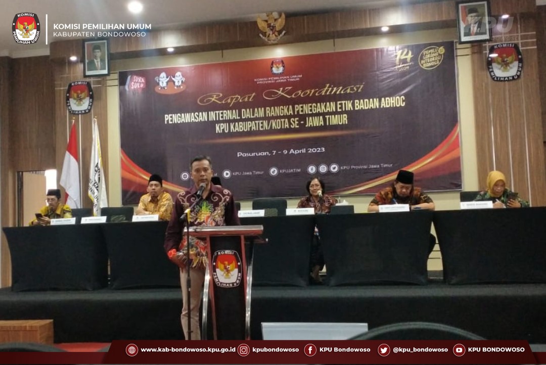 Pasuruan - Komisi Pemilihan Umum Kabupaten Bondowoso hadiri Rapat Koordinasi Pengawasan Internal Dalam Rangka Penegakan Etik Badan Adhoc KPU Kabupaten/Kota Se-Jawa Timur. Kegiatan yang dilaksanakan di Kantor Komisi Pemilihan Umum Kabupaten Pasuruan pada tanggal 7 sampai 9 April 2023 dengan mengundang Ketua KPU, Divisi Hukum dan Pengawasan, Divisi Sosdiklih, Parmas dan SDM, Sekretaris dan Kepala Subbagian Hukum dan SDM dari 38 KPU Kabupaten/Kota di wilayah Jawa Timur. Selanjutnya, acara diisi sambutan dan pembukaan oleh Divisi Teknis Penyelenggaraan KPU Provinsi Jawa Timur, Insan Qoriawan. Dalam kesempatan tersebut, Divisi Teknis Penyelenggaraan Menyampaikan bahwa hari ini adalah acara yang yang luar biasa karena menghadirkan narasumber yang merupakan Anggota Dewan Kehormatan Penyelenggara Pemilu (DKPP). Tidak semuanya bisa bertatap muka dan mendapatkan arahan langsung oleh Anggota DKPP. "Kita berharap tidak banyak masalah yang kita hadapi nanti terkait Badan Adhoc, tapi mau tidak mau jika ada masalah kita harus siap untuk menyelesaikan masalah tersebut agar tidak berimplikasi ke masalah selanjutnya" tambahnya. Selain itu Insan Qoriawan juga menyampaikan kepada peserta rapat untuk bisa mengatur semua dengan sangat baik, seperti Sumber Daya Manusia yang ada di kantor termasuk jajaran di bawah serta manajemen waktu yang baik. "Kita sebagai penyelenggara yang sudah pernah bersumpah di bawah kitab suci masing-masing harus berkomitmen mensukseskan seluruh agenda tahapan yang sudah dijadwalkan dan dituangkan di Peraturan atau Keputusan KPU." Pungkanya.(Alv)