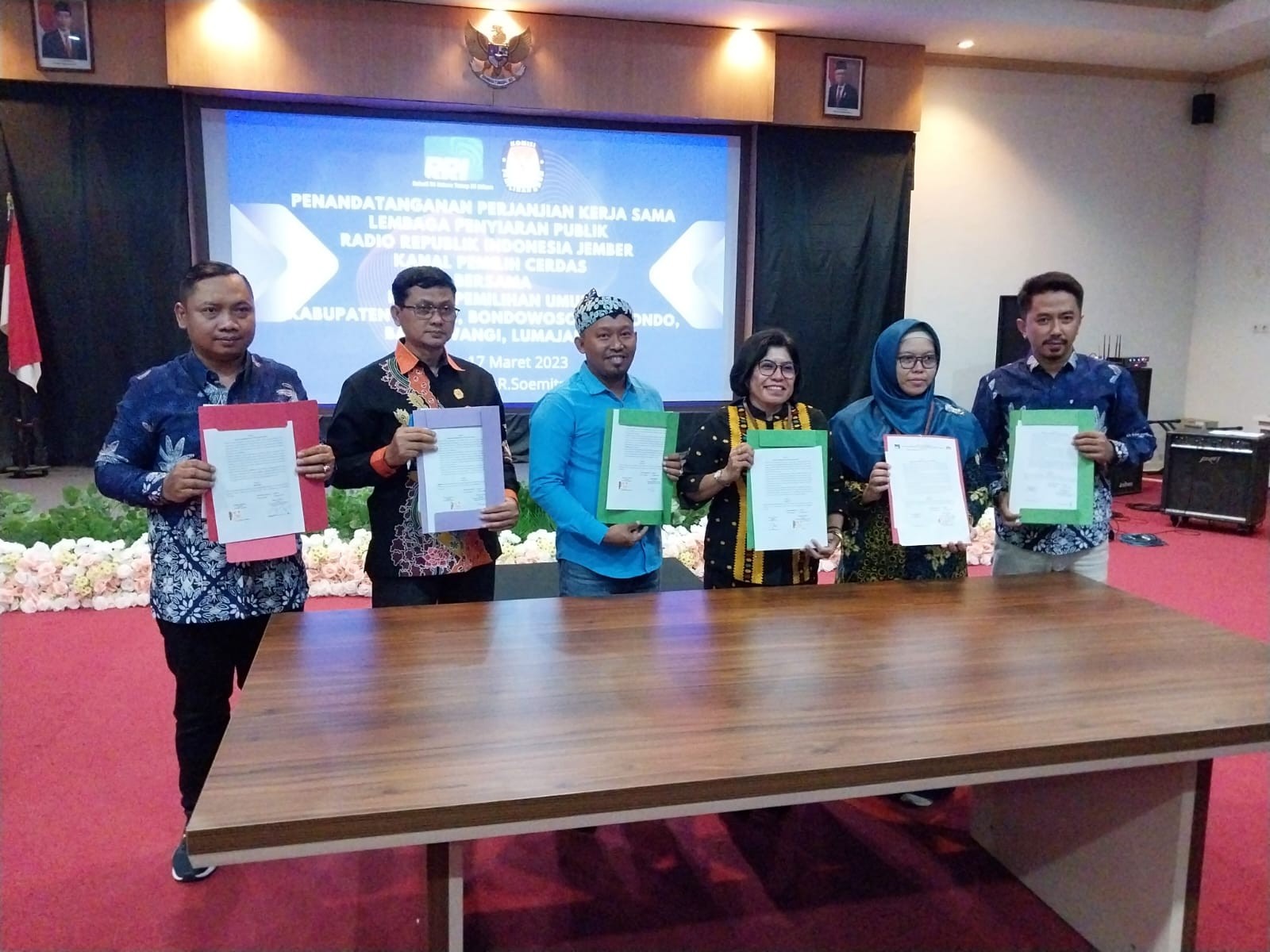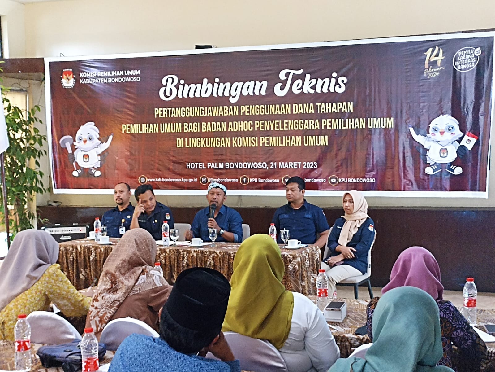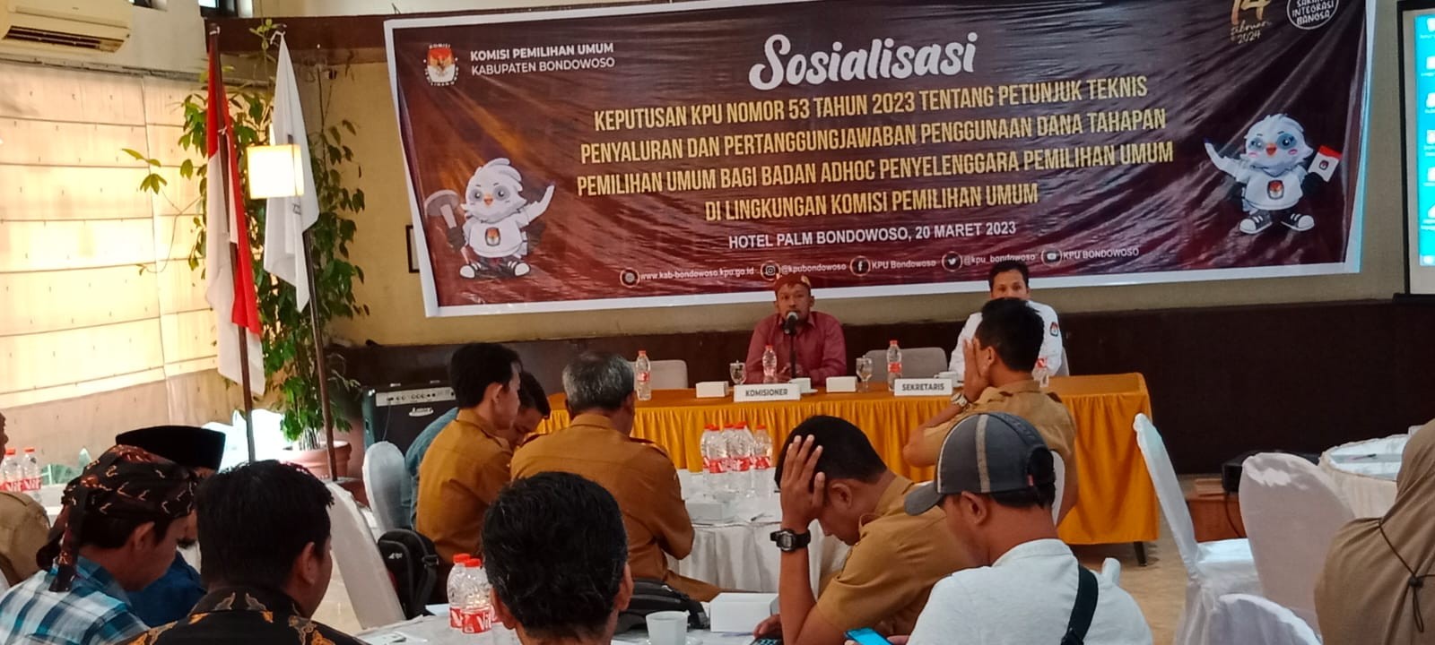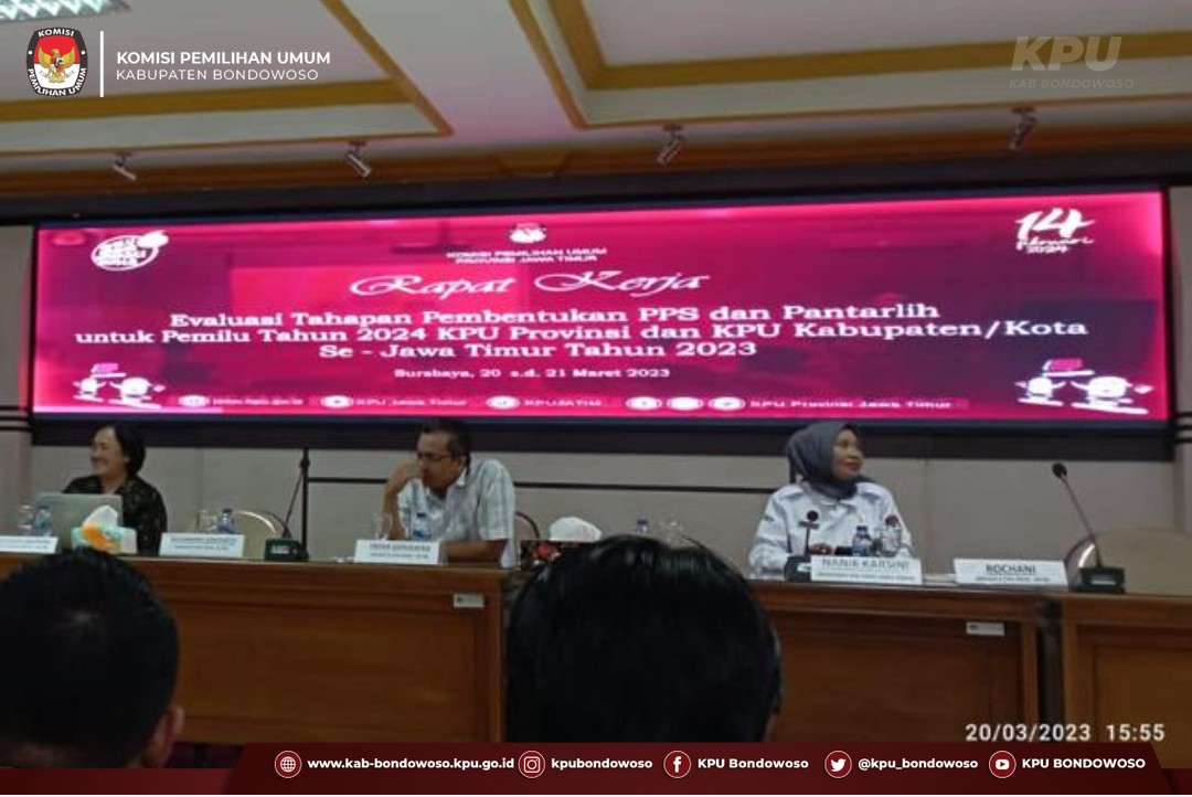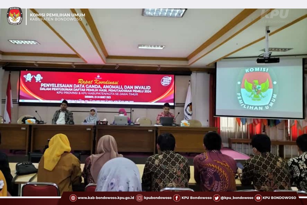 Surabaya (23/03/2023) - Komisi Pemilihan Umum (KPU) Kabupaten Bondowoso menghadiri Rapat Koordinasi dan Persiapan Relapitulasi Hasil Verifikasi Administrasi Dukungan Minimal Pemilih Perbaikan Kedua Pencalonan Perseorangan Anggota Dewan Perwakilan Daerah pada Pemilihan Umum Tahun 2024 Tingkat Provinsi Jawa Timur, Kamis (23/03/2023). Kegiatan diselenggarakan oleh KPU Provinsi Jawa Timur bersama dengan KPU Kabupaten/Kota Se-Jawa Timur di Ballroom Hotel Artotel TS Surabaya. Kegiatan rapat koordinasi dilaksanakan dengan mengundang Anggota KPU Divisi Teknis Penyelenggaraan dan Kasubbag Teknis Penyelenggaraan, Partisipasi dan Hubungan Masyarakat. Mewakili KPU Kabupaten Bondowoso adalah Anggota KPU Kabupaten Bondowoso, Heniwati, dan Kasubbag Tekmas, Mohammad Ilyas Purwo Agomo. Dalam sambutannya, Ketua KPU Provinsi Jawa Timur, Choirul Anam, menyampaikan beberapa pesan agar KPU Kabupaten/Kota tidak kaget terhadap berbagai macam keputusan-keputusan yang dikeluarkan oleh lembaga-lembaga di luar KPU yang berimbas pada tahapan KPU. Choirul Anam juga menambahkan bahwa saat ini cukup banyak gelombang yang datang, akan tetapi harus tetap tenang dan tetap menjalankan tahapan sesuai yang diperintahkan KPU RI dalam Peraturan KPU Nomor 3 Tahun 2022 maupun peraturan-peraturan lainnya. Selanjutnya, kegiatan rakor dipimpin oleh Anggota KPU Provinsi Jawa Timur, Insan Qoriawan. Diawali dengan arahan umum yang dilakukan oleh masing-masing Anggota KPU Provinsi Jawa Timur dan Sekretaris KPU Provinsi Jawa Timur. Selanjutnya adalah persiapan dan identifikasi masalah dalam prosws verifikasi administrasi kedua dukungan calon anggota DPD. (mipa)