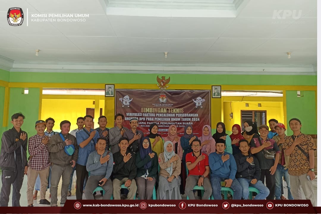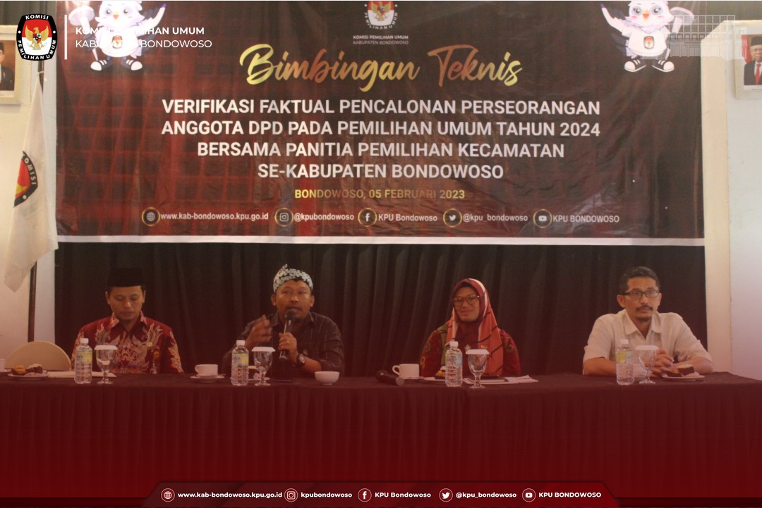 Bondowoso (09/02/2023) – Komisi Pemilihan Umum (KPU) Kabupaten Bondowoso melaksanakan Rapat Koordinasi dan Penyerahan Lembar Kerja Verifikasi Faktual Dukungan Calon Perseorangan DPD pada Pemilu Tahun 2024 kepada 14 Panitia Pemilihan Kecamatan (PPK) di wilayah kerja KPU Kabupaten Bondowoso, Kamis (09/02/2023). Rapat Koordinasi dilaksankan di Kantor KPU Kabupaten Bondowoso dan dihadiri oleh perwakilan dari Bawaslu serta Anggota PPK dari 14 kecamatan yang membidangi bagian teknis penyelenggaraan. Sampai dengan saat ini, data yang akan diverifikasi faktual sejumlah 207 orang pendukung yang tersebar dalam 14 kecamatan, diantaranya adalah Kecamatan Bondowoso, Tenggarang, Tapen, Cermee, Pujer, Tlogosari, Sumber Wringin, Tamanan, Jambesari DS, Wringin, Pakem, Curahdami, Tegal Ampel dan Taman Krocok. Lembar Kerja Verifikasi Faktual Dukungan Calon Perseorangan DPD pada Pemilu Tahun 2024 tersebut diunduh dari Aplikasi Silon DPD. Ketua KPU Kabupaten Bondowoso, Junaidi, menyampaikan sambutan pembukaan sekaligus membuka kegiatan Rapat Koordinasi dan Penyerahan Lembar Kerja Verifikasi Faktual Dukungan Calon Perseorangan DPD pada Pemilu Tahun 2024. Dalam sambutannya Junaidi menekankan agar PPK dapat bekerja dengan baik sebagaimana ketentuan aturan perundangan. Sementara itu, Anggota KPU Divisi Teknis Penyelenggara, Heniwati, menyampaikan pesan agar PPK segera melakukan bimbingan teknis kepada Panitia Pemungutan Suara (PPS) dan menyampaikan Penyerahan Lembar Kerja Verifikasi Faktual Dukungan Calon Perseorangan DPD pada Pemilu Tahun 2024 kepada PPS agar bisa segera dilakukan verifikasi faktual. Sebagaimana diketahui bahwa saat ini, tahapan Pencalonan Anggota Dewan Perwakilan Daerah pada Pemilu Tahun 2024 memasuki tahap Verifikasi Faktual Dukungan Calon Perseorangan DPD. Tahapan sebagaimana dimaksud dilaksanakan pada tanggal 6 Februari 2023 sampai dengan 26 Februari 2023. (mipa)