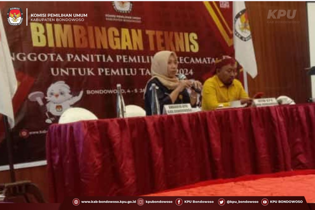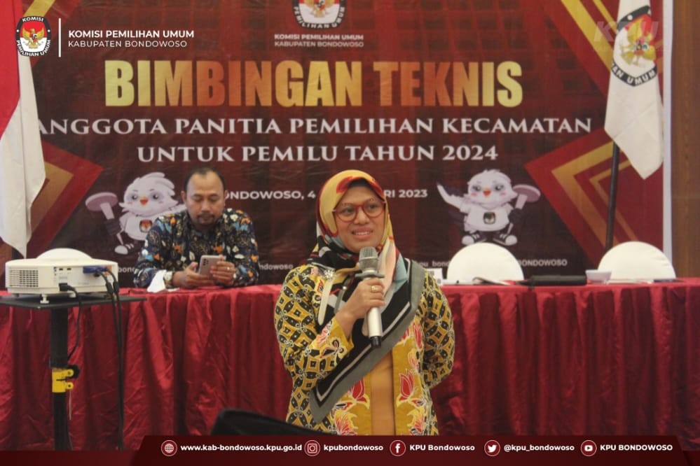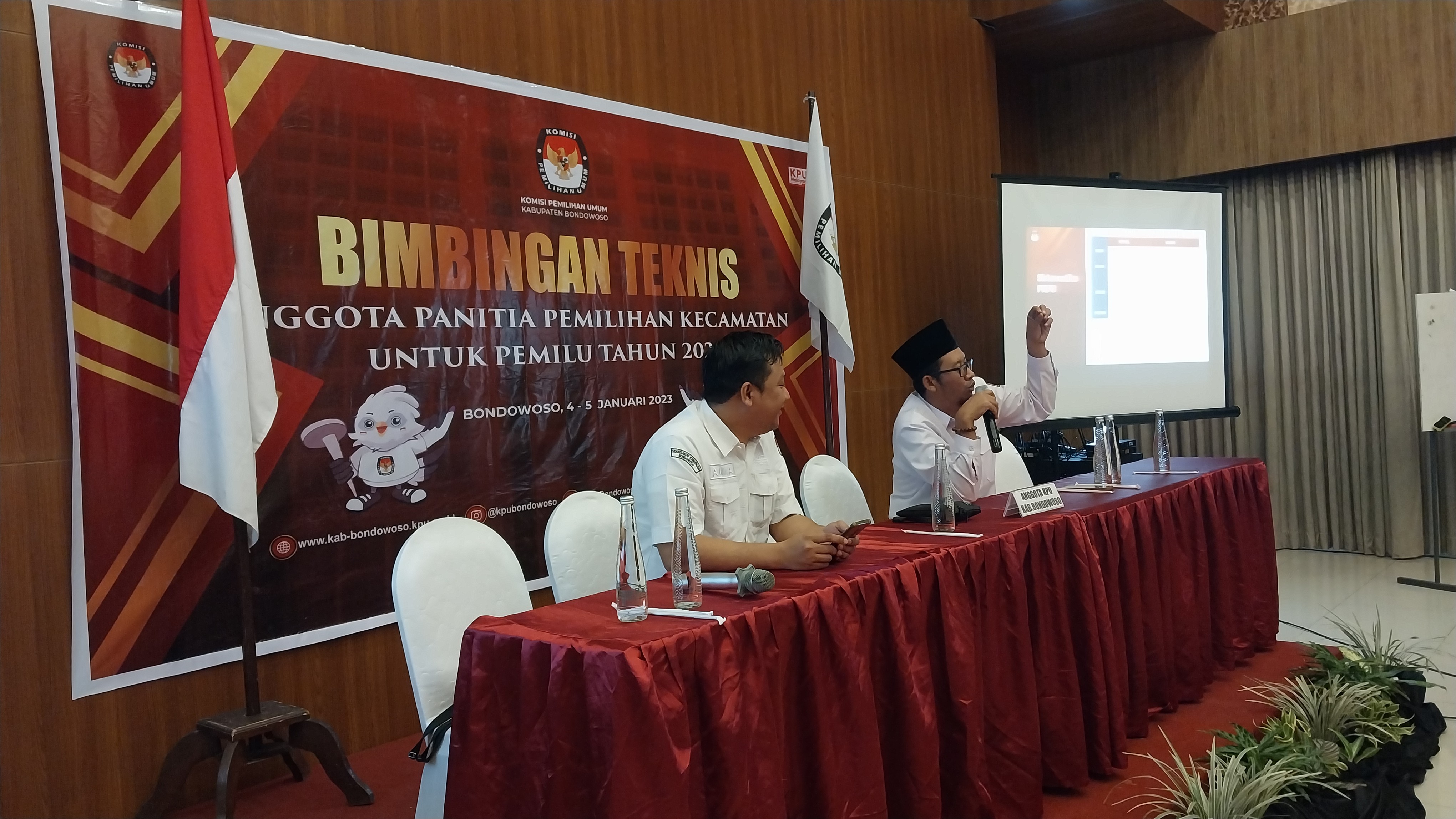 Bondowoso (05/01/2023) - Isu-isu penting yang beredar dalam masyarakat sehubungan dengan bidang kerja KPU dan Pemilu serta Pemilihan menjadi pokok perhatian serius. Hal tersebut juga merupakan tantangan tersendiri bagi penyelenggara pemilu dan pemilihan. Oleh karena itu, secara kelembagaan, KPU harus dipahami secara utuh. Kelembagaan KPU menjadi materi pertama hari ke-2 dalam Bimbingan Teknis PPK Pemilu 2024 Se-Kabupaten Bondowoso, Kamis (05/06/2023). Narasumber dalam sesi ini adalah Ali Mushoffa, Anggota KPU Divisi Perencanaan, Data dan Informasi. Pokok materi adalah terkait tantangan penyelenggara, kesiapan dan soliditas lembaga. Ali Mushoffa menjelaskan beberapa diagram dan bagan tentang kelembagaan KPU serta beberapa model transformasi kelembagaan penyelenggara pemilu. Bagaimana hubungan KPU dengan Bawaslu dan DKPP. Selain itu, ditengah-tengah penyampaian materi terkait kelembagaan, Ali Mushoffa menyisipkan materi tentang Pemutakhiran Data Pemilih yang terdapat dalam Peraturan KPU Nomor 7 Tahun 2022 (umam]