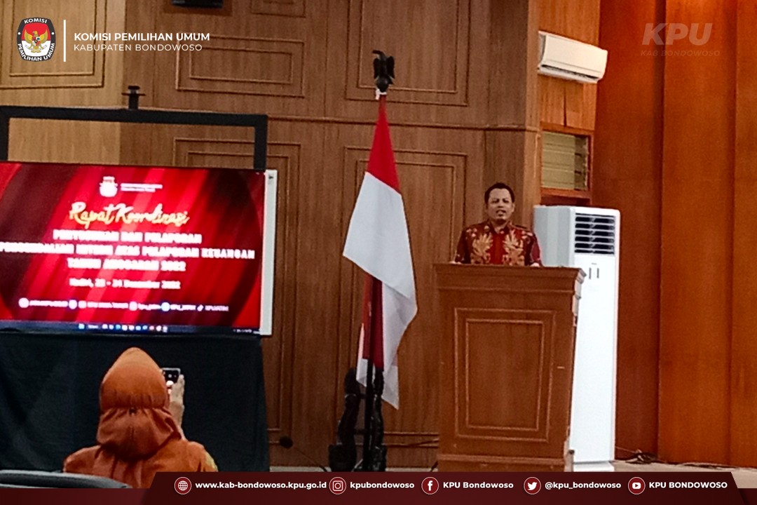 Kediri (24/12/2022), Komisi Pemilihan Umum Kabupaten Bondowoso menghadiri Rapat Koordinasi Penyusunan dan Pelaporan Pengendalian Intern atas Pelaporan Keuangan (PIPK) Tahun Anggaran 2022. Kegiatan terlaksana mulai tanggal 23 sampai 24 Desember 2022 di Kantor Dewan Perwakilan Rakyat Daerah (DPRD) Kabupaten Kediri, acara dibuka oleh Ketua KPU Provinsi Jawa Timur, Choirul Anam. "Terimakasih atas kehadirannya, kegiatan ini diselenggarakan untuk koordinasi, evaluasi serta tata tertib dalam mewujudkan penyusunan keuangan", pungkasnya Ia juga menyampai terimakasih kepada satuan kerja KPU Kabupaten/Kota yang telah menerapkan Chashless Managenent System (CMS). Kemudian acara dilanjutkan dengan beberapa pengarahan dari KPU Provinsi Jawa Timur serta ucapan selamat datang oleh Ketua KPU Kabupaten Kediri, Ninik Sunarmi Kepada Peserta Rapat, sebelum materi rapat koordinasi disampaikan. Peserta rapat koordinasi tersebut dihadiri oleh 38 KPU Kabupaten/Kota Se-Jawa Timur dengan mengundang Ketua, Kuasa Pengguna Anggaran (KPA), Pejabat Penandatanganan SPM (PPSPM), Bendahara Pengeluaran dan operator keuangan. (Dy)