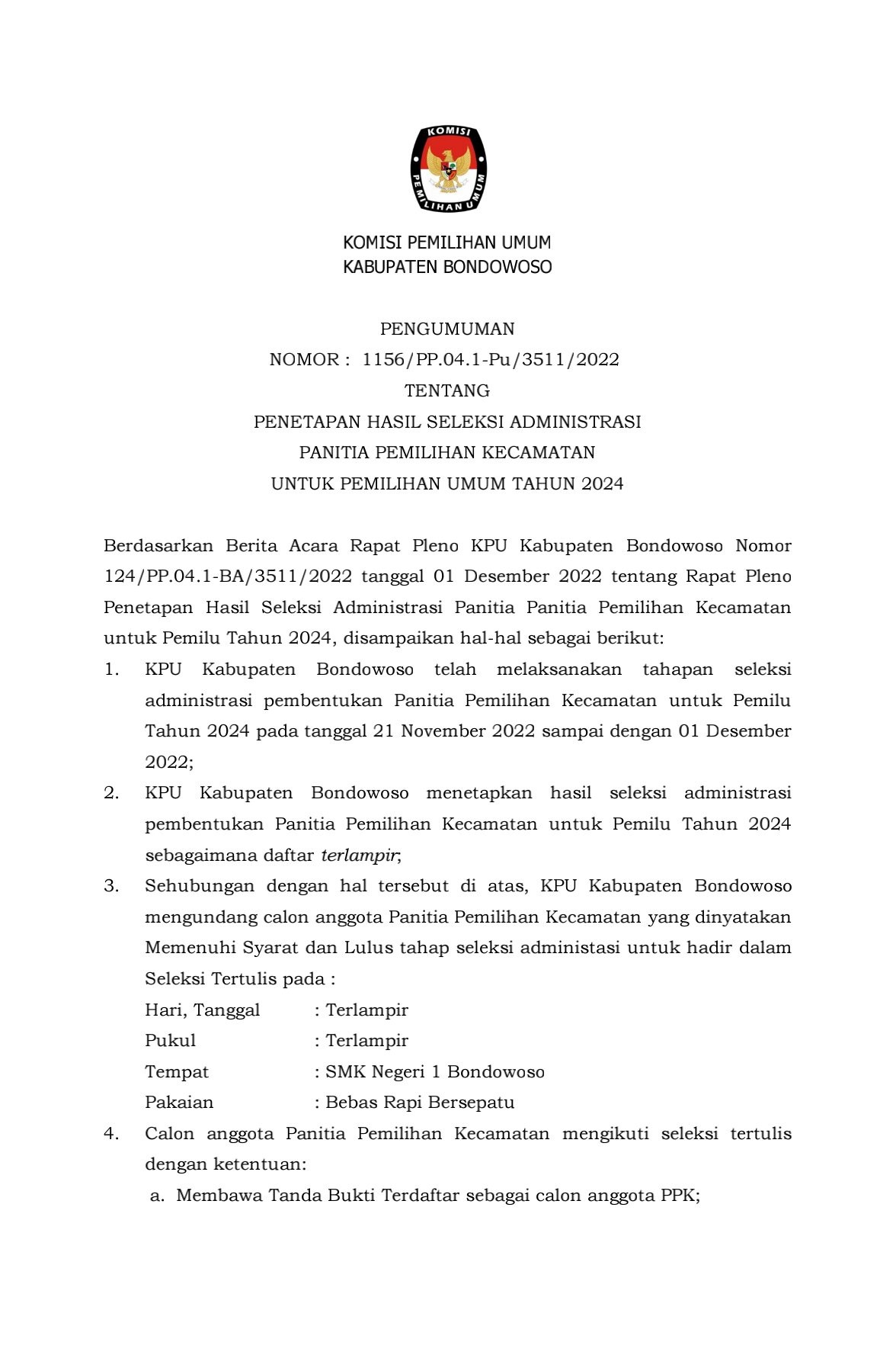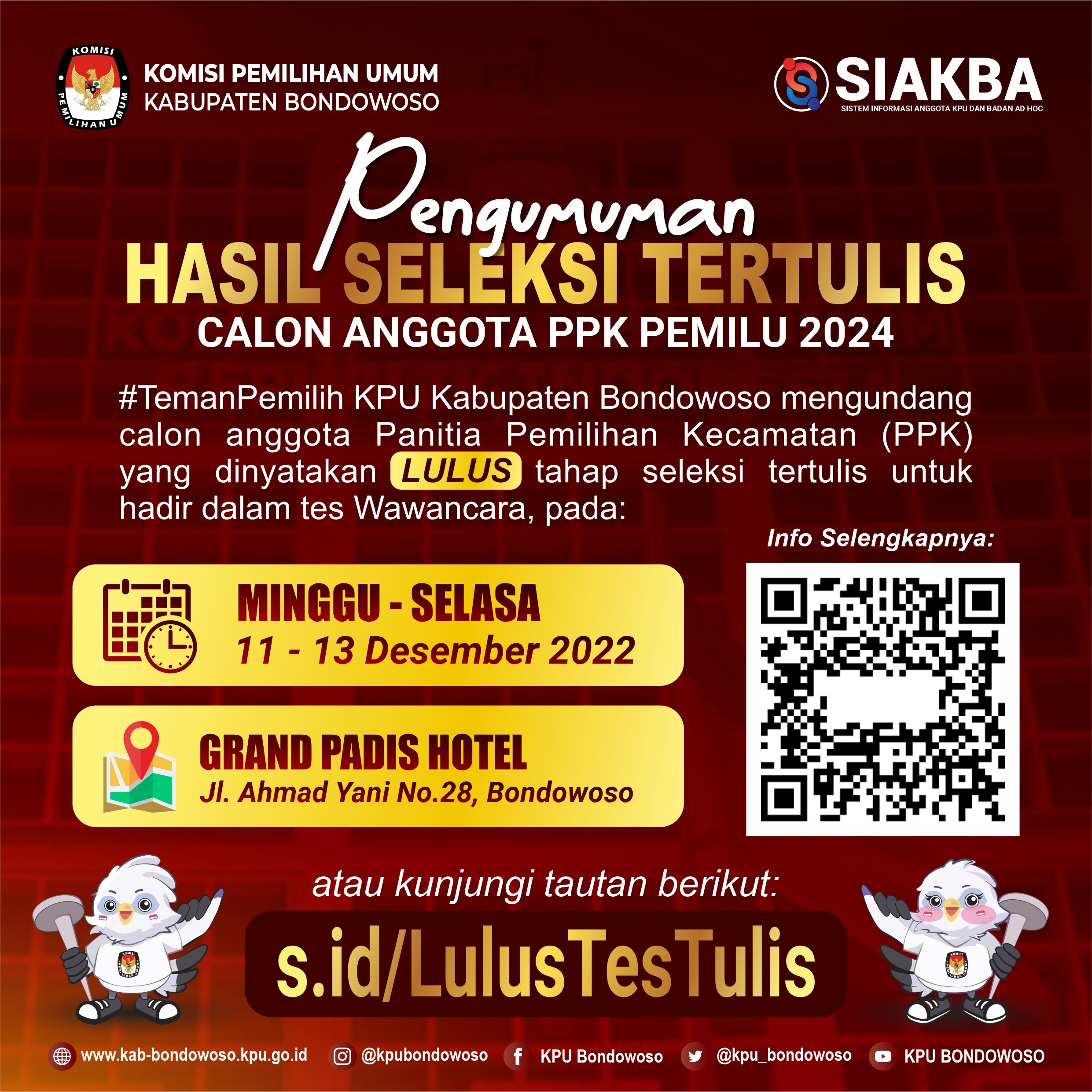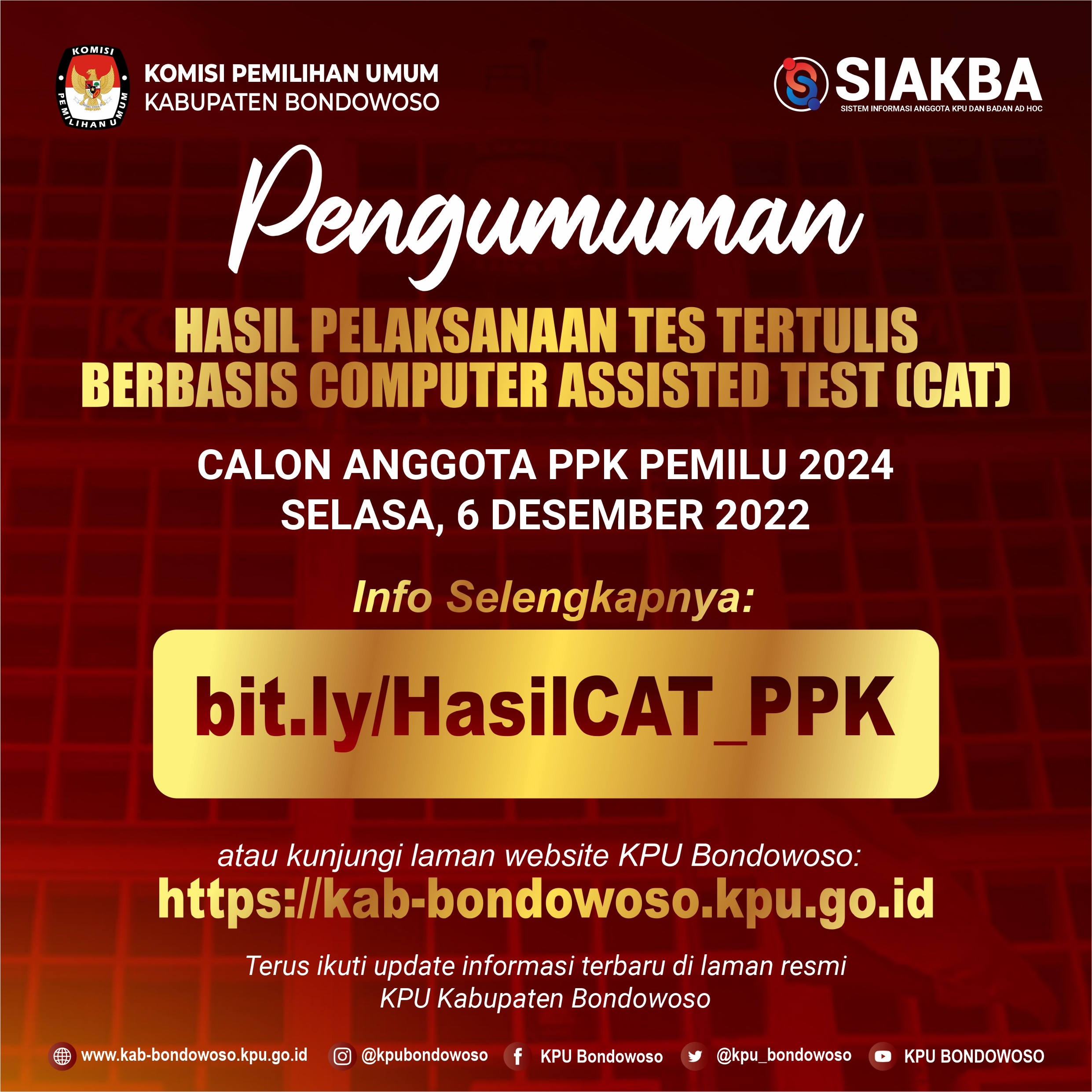 Halo #temanpemilih berikut ini pengumuman hasil tes tertulis Berbasis Assisted Test (CAT) yang dilaksanakan pada hari Selasa, 6 Desember 2022. Info selengkapnya bisa diunduh DISINI